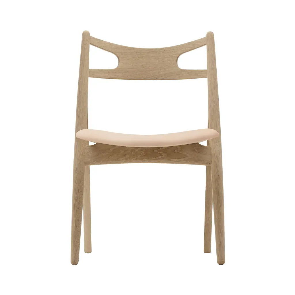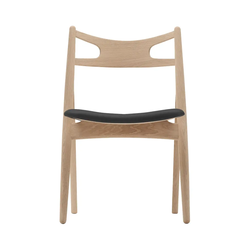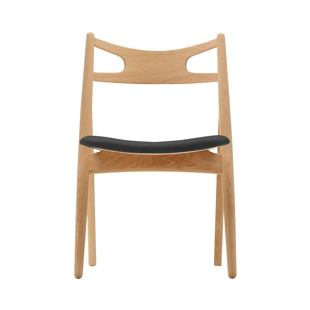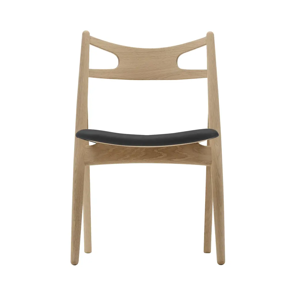 Named for sawhorses used by carpenters that inspired him, Hans J. Wegner designed CH29P in 1952 in solid oak and added upholstered comfort to seal the bargain. With its clean, simple lines, Sawbuck’s seat is significantly wider at the front and, along with its very curved back, lends sitting ease in varied positions.