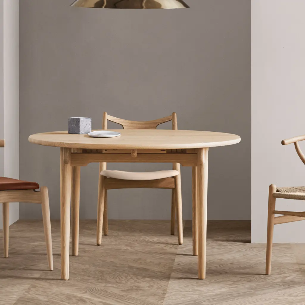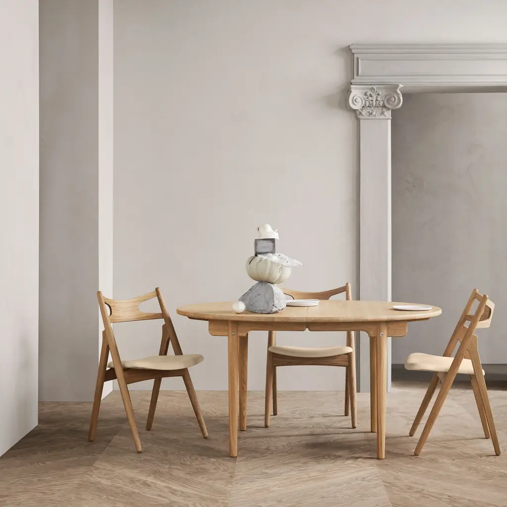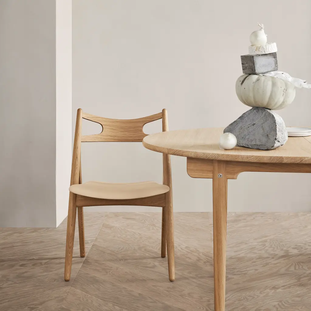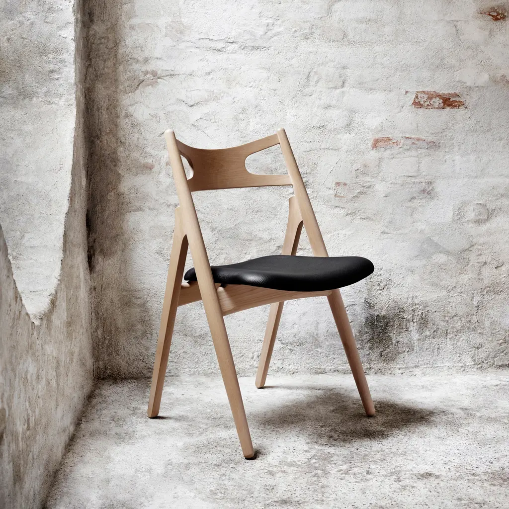 Named for sawhorses used by carpenters that inspired him, Hans J. Wegner designed CH29P in 1952 in solid oak and added upholstered comfort to seal the bargain. With its clean, simple lines, Sawbuck’s seat is significantly wider at the front and, along with its very curved back, lends sitting ease in varied positions.