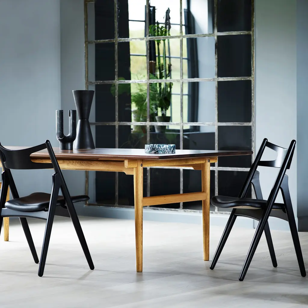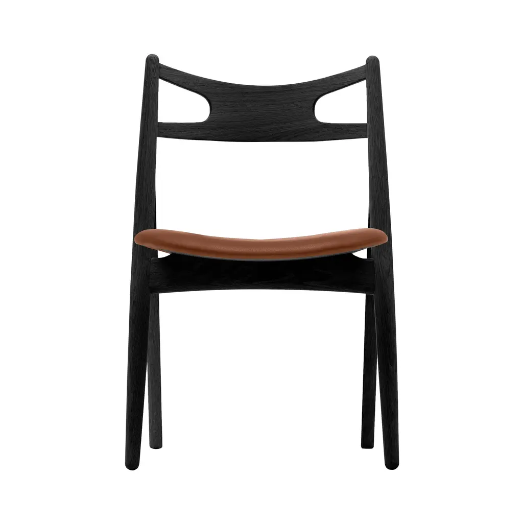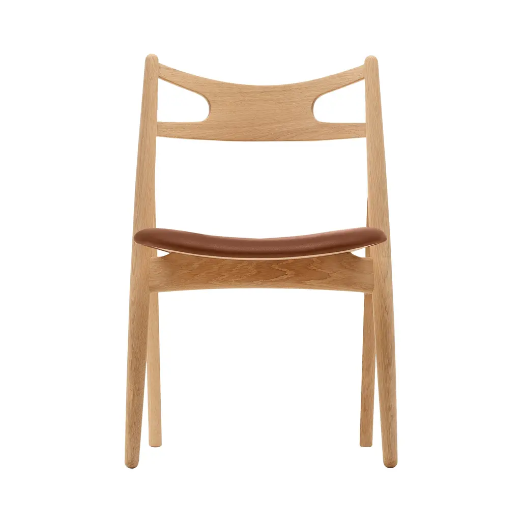 Named for sawhorses used by carpenters that inspired him, Hans J. Wegner designed CH29P in 1952 in solid oak and added upholstered comfort to seal the bargain. With its clean, simple lines, Sawbuck’s seat is significantly wider at the front and, along with its very curved back, lends sitting ease in varied positions.