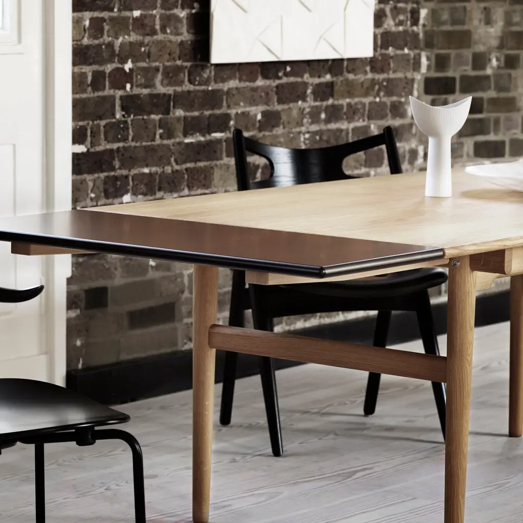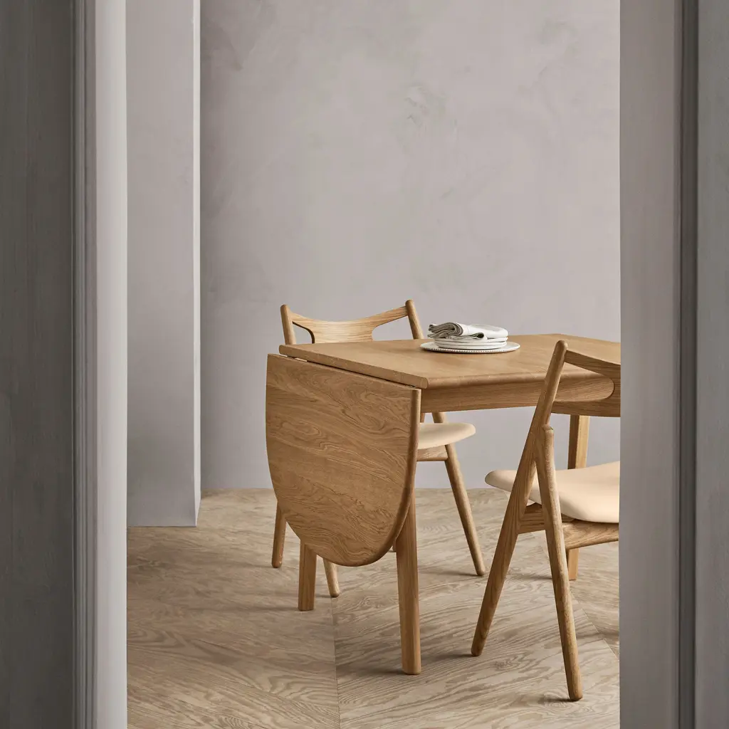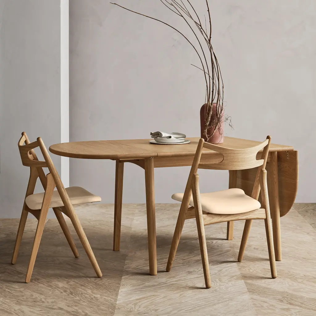 Named for sawhorses used by carpenters that inspired him, Hans J. Wegner designed CH29P in 1952 in solid oak and added upholstered comfort to seal the bargain. With its clean, simple lines, Sawbuck’s seat is significantly wider at the front and, along with its very curved back, lends sitting ease in varied positions.