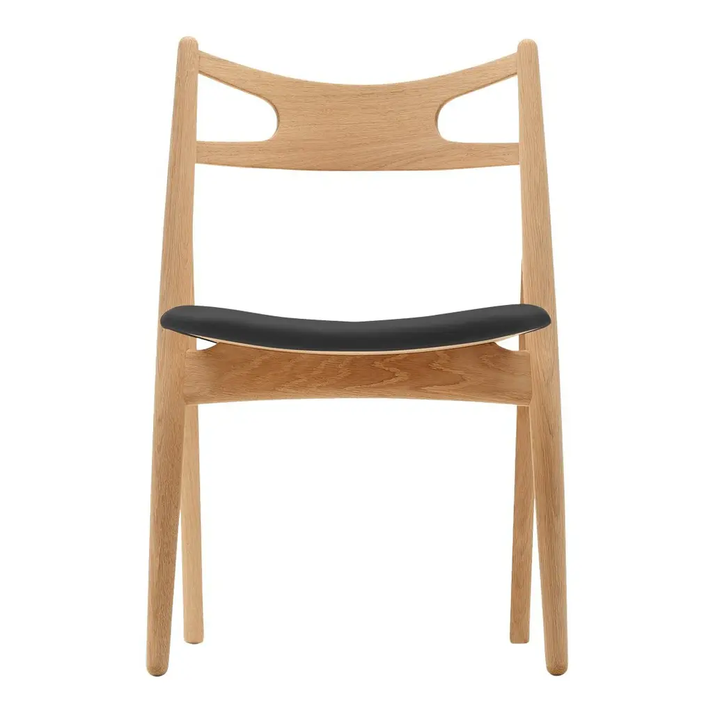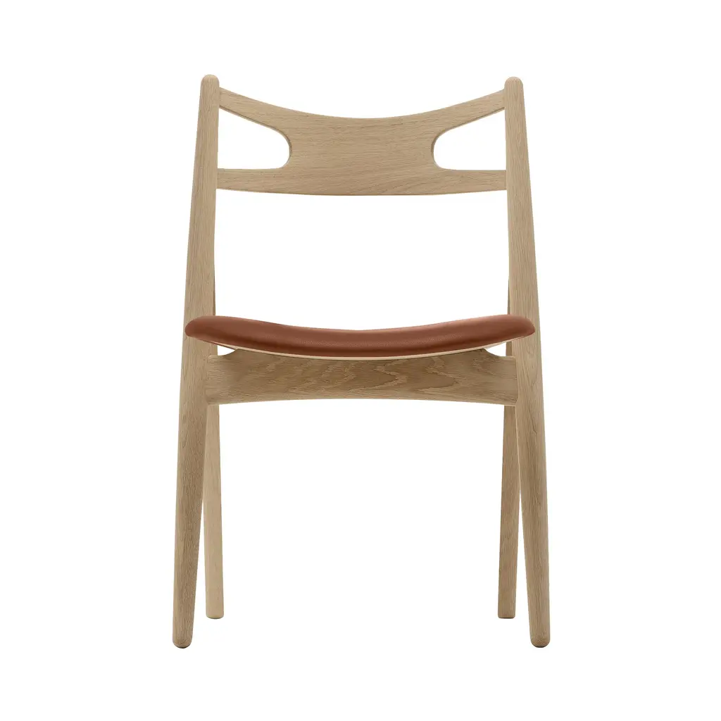 The Wegner CH29 chair was designed in 1952. The cutting out in the sides of the back, the pointed legs and the elaborate execution of the joint between forelegs and hind legs are details making the sawhorse chair a distinctive and sculptural piece of furniture. Wegner's construction of the CH29 has resulted in a chair as sturdy as any traditional chair but with the use of fewer parts. The heavily curved back and wide seat front makes it a very comfortable chair.
