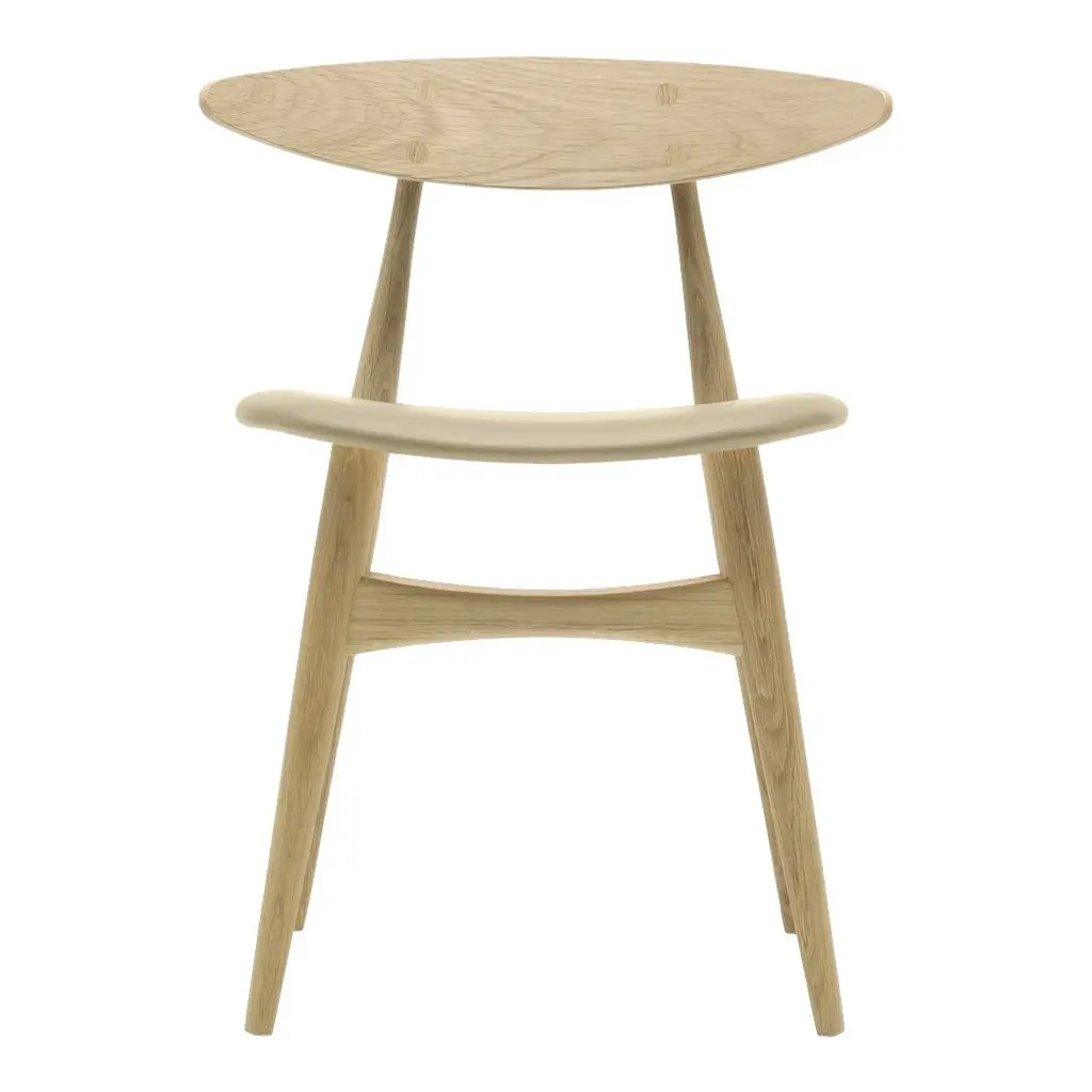 A star reborn: A compact design by Wegner from 1957 has been re-issued by Carl Hansen. A solid wood frame with a veneer seat and back - a contrasting wood can be chosen for the back but the buttons are always the same wood as the frame. Shown with a leather seat. Available in all leathers and fabrics offered by Carl Hansen & Son. Seat back matches frame. For $95 you can create a mixed wood version, but note that the buttons are always in the same wood as the frame. Call for more information or to order: 800.688.0974.