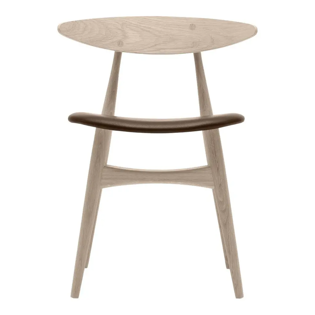 A star reborn: A compact design by Wegner from 1957 has been re-issued by Carl Hansen. A solid wood frame with a veneer seat and back - a contrasting wood can be chosen for the back but the buttons are always the same wood as the frame. Shown with a leather seat. Available in all leathers and fabrics offered by Carl Hansen & Son. Seat back matches frame. For $95 you can create a mixed wood version, but note that the buttons are always in the same wood as the frame. Call for more information or to order: 800.688.0974.