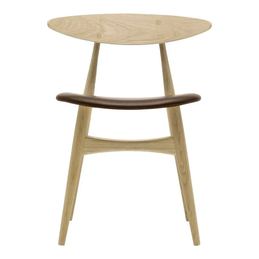 A star reborn: A compact design by Wegner from 1957 has been re-issued by Carl Hansen. A solid wood frame with a veneer seat and back - a contrasting wood can be chosen for the back but the buttons are always the same wood as the frame. Shown with a leather seat. Available in all leathers and fabrics offered by Carl Hansen & Son. Seat back matches frame. For $95 you can create a mixed wood version, but note that the buttons are always in the same wood as the frame. Call for more information or to order: 800.688.0974.