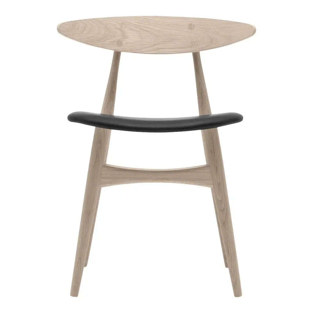 A star reborn: A compact design by Wegner from 1957 has been re-issued by Carl Hansen. A solid wood frame with a veneer seat and back - a contrasting wood can be chosen for the back but the buttons are always the same wood as the frame. Shown with a leather seat. Available in all leathers and fabrics offered by Carl Hansen & Son. Seat back matches frame. For $95 you can create a mixed wood version, but note that the buttons are always in the same wood as the frame. Call for more information or to order: 800.688.0974.