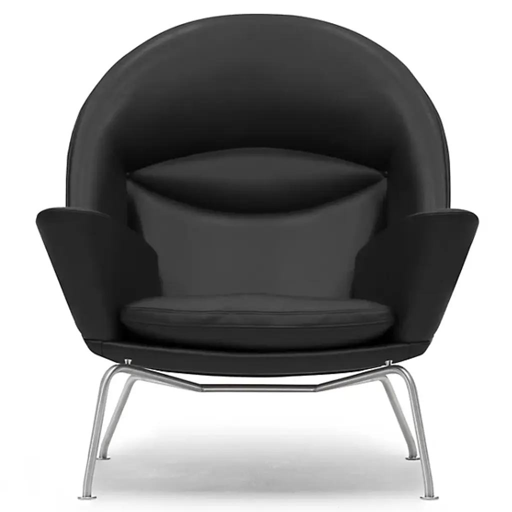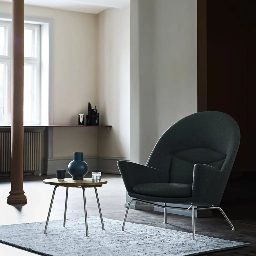 Carl Hansen & Son's close co-operation with Hans J. Wegner's Studio has made it possible to recreate an original Wegner easy chair from a clay model and drawings found in the Studio's archives. Called CH468 Oculus, the chair was created by Wegner in 1960 but has never been in production - until now. The Studio also had what is, as far as is known, the only existing prototype of the chair. Along with some photos, the prototype inspired us to begin production. CH468 is a sculptural easy chair whose construction, back and neck support afford a variety of very comfortable ways to sit. Our craftsmen build the interior frame from wood, just as Wegner designed it. The legs, in brushed or powder-coated stainless steel, create a balanced contrast to the capacious upholstery