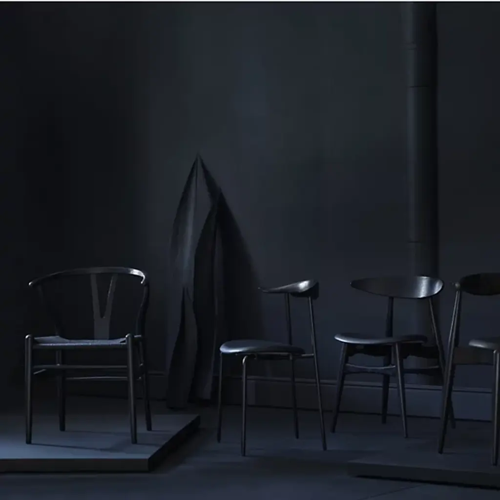 The bullish look of the CH88P Chair, with a softer side. The Carl Hansen CH88P Chair - Black Edition features a black powder coated tubular steel frame with a sharp, horn-like back made out of solid beech--also stained black. The molded wood veneer seat complements the all-black finish with a choice of specialty Fiord fabric or Thor leather upholstery.