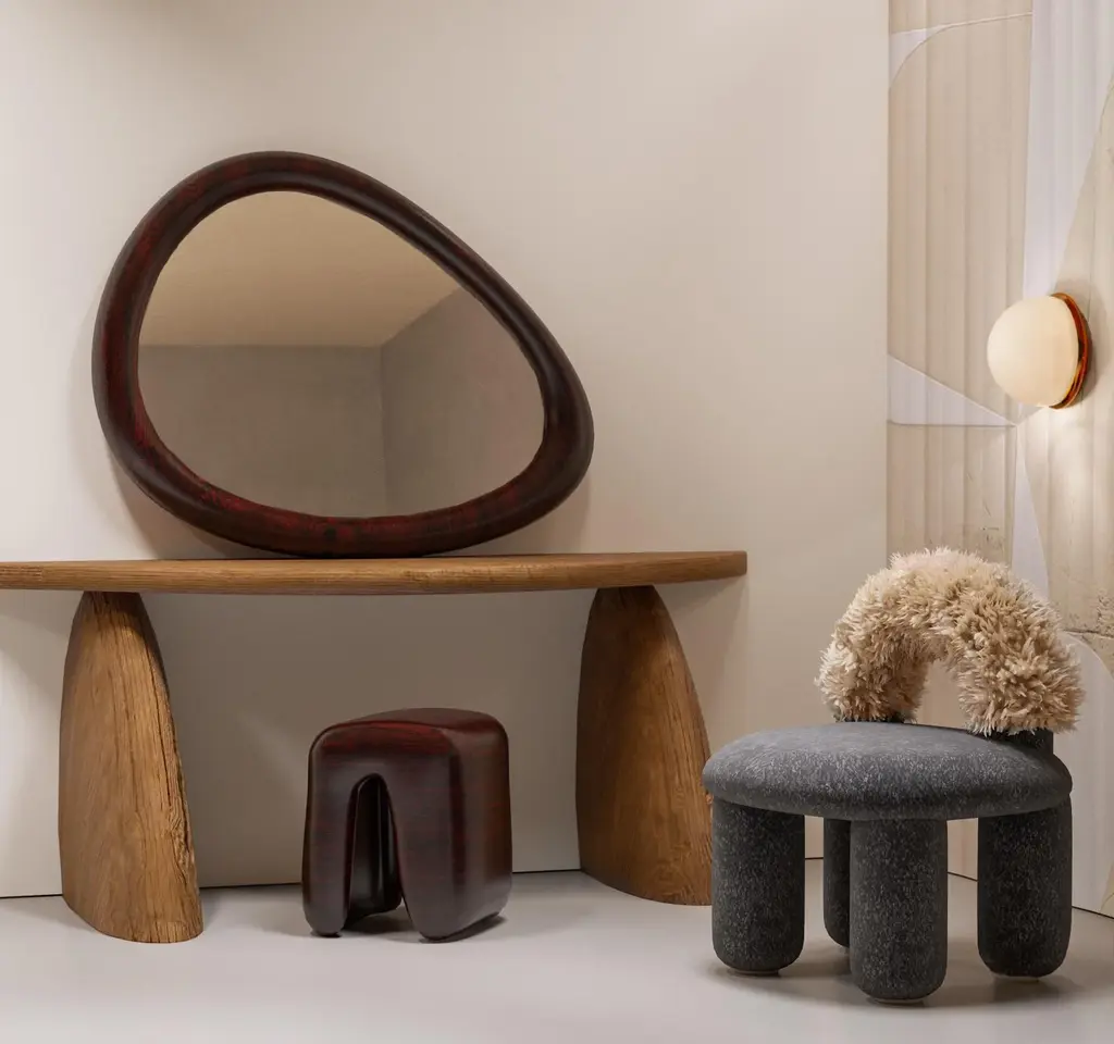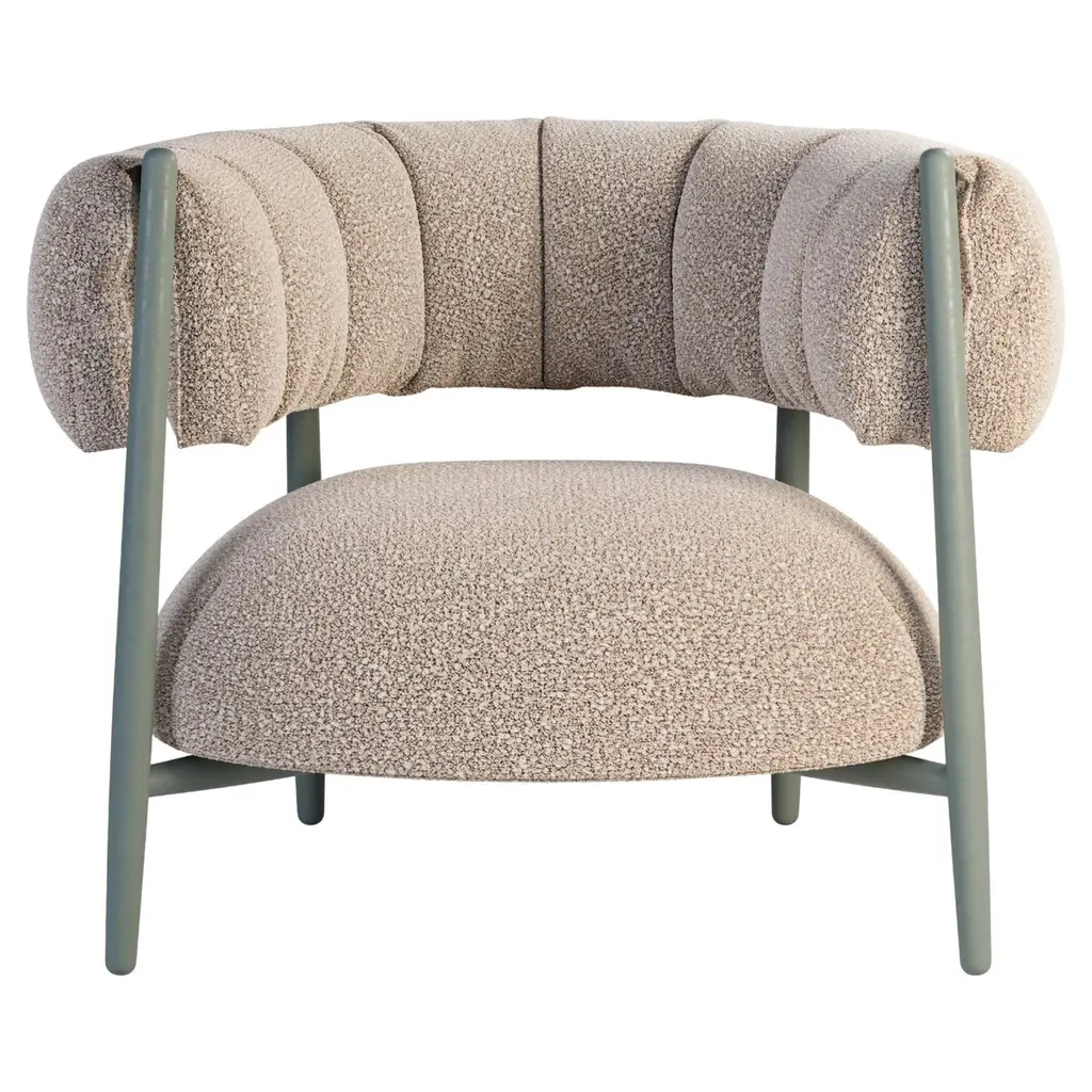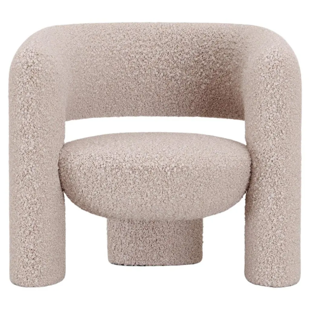 An updated modification of the Arcy armchair with a voluminous backrest upholstered in mohair, sheepskin or fur