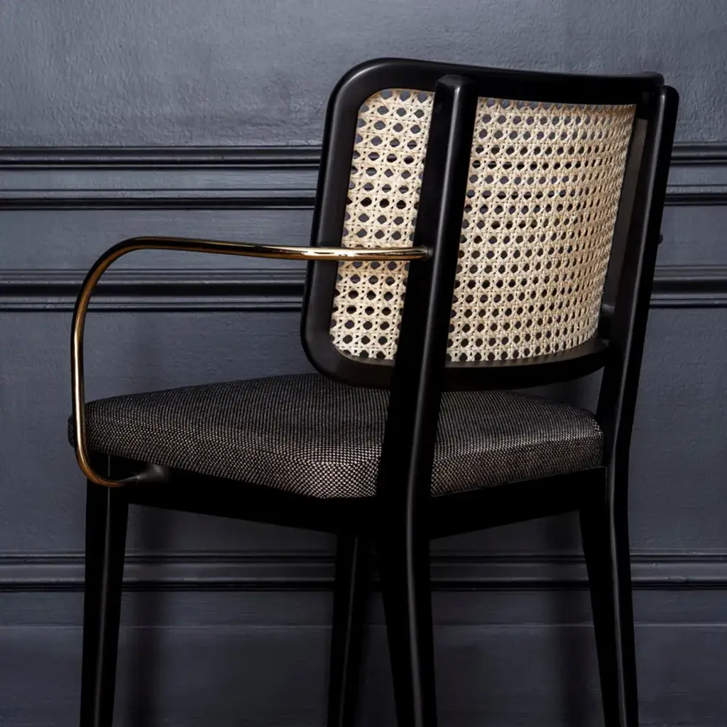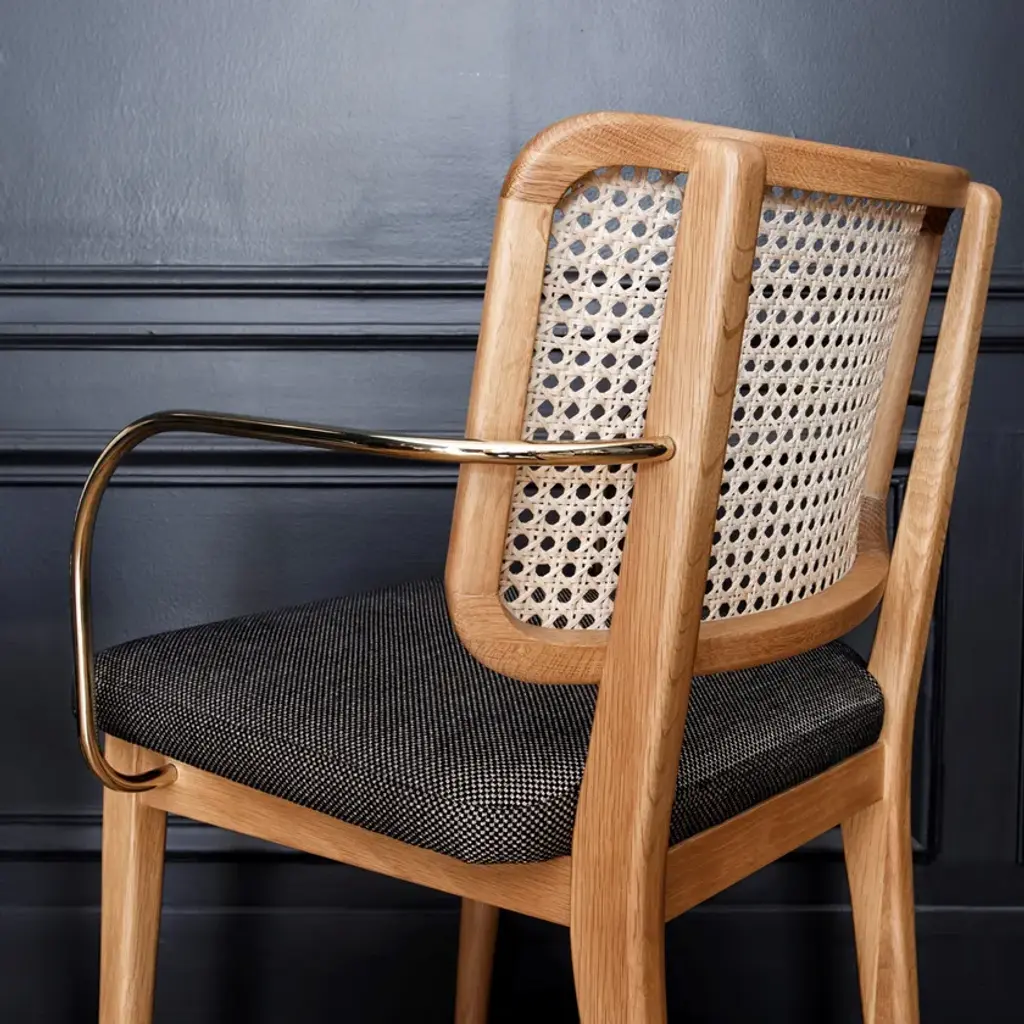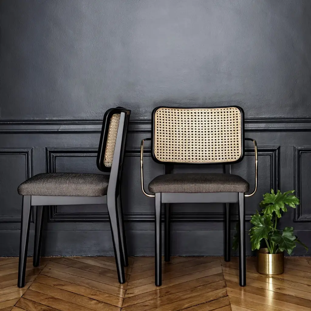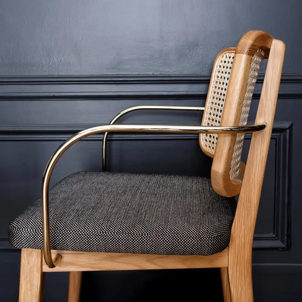 The Red Edition cane chair is nothing less than absolute comfort and familiarity. All the spirit of Parisian brasseries, cosy and elegant, is nestled in this chair which marries materials such as its polished, chic brass armrests with verve.The frame is made of natural or stained-black oak. The seat is made of either foam/leather or foam/fabric.Red Edition is able to customize your piece even with the leather or fabric of your own choosing, a service limited to a minimum of 6 pieces.MaterialsSolid oak frame in natural or black finish.Seat upholstered in leather or fabric.Brass armrest version available.The structure of the Wicker Chair is made of natural or black oak. The seat is made of foam/leather or foam/fabric.The wicker chair is available in two versions, with or without brass armrests.
