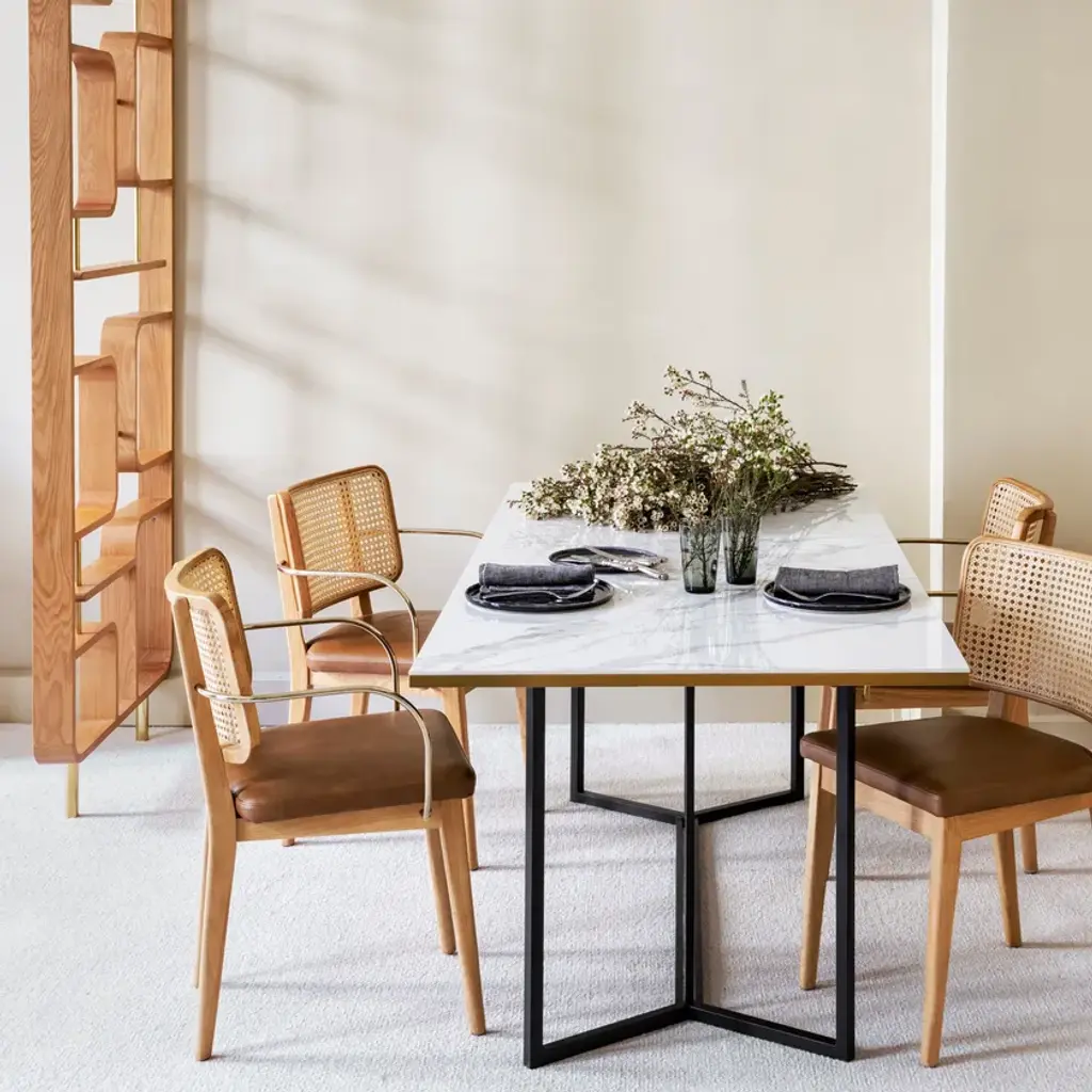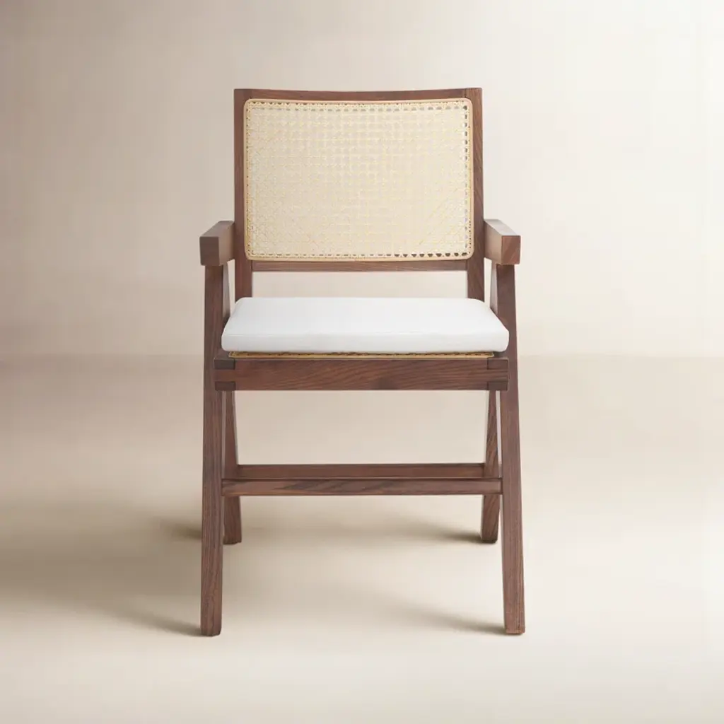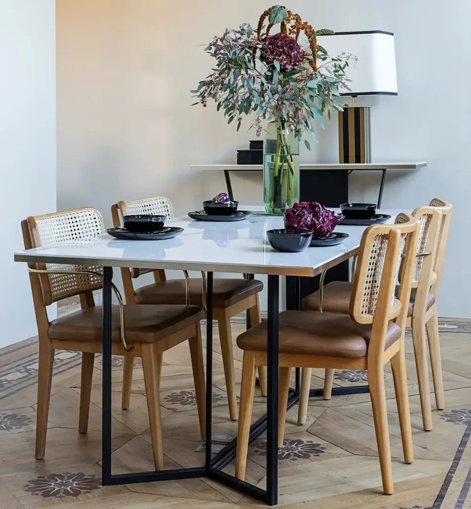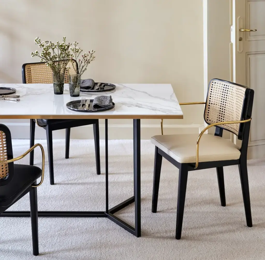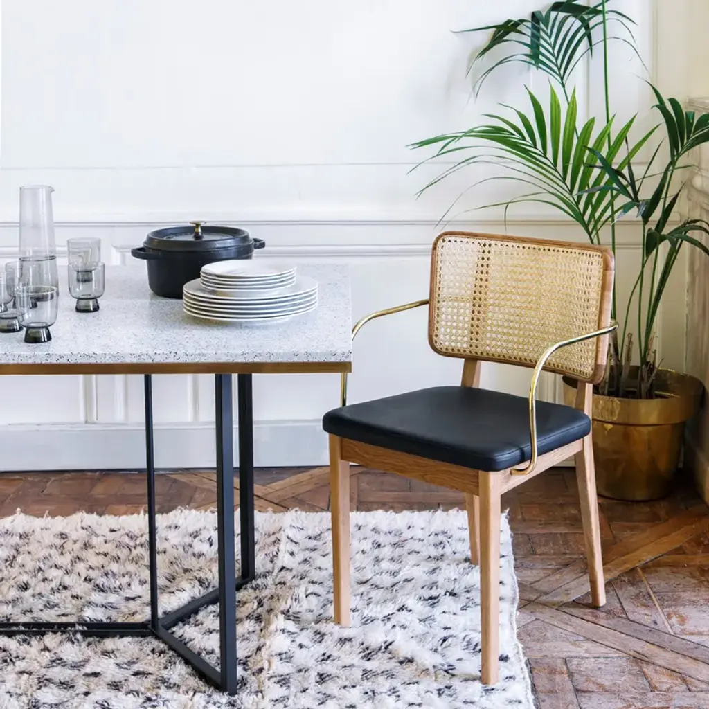 The Red Edition cane chair is nothing less than absolute comfort and familiarity. All the spirit of Parisian brasseries, cosy and elegant, is nestled in this chair which marries materials such as its polished, chic brass armrests with verve.The frame is made of natural or stained-black oak. The seat is made of either foam/leather or foam/fabric.Red Edition is able to customize your piece even with the leather or fabric of your own choosing, a service limited to a minimum of 6 pieces.MaterialsSolid oak frame in natural or black finish.Seat upholstered in leather or fabric.Brass armrest version available.The structure of the Wicker Chair is made of natural or black oak. The seat is made of foam/leather or foam/fabric.The wicker chair is available in two versions, with or without brass armrests.
