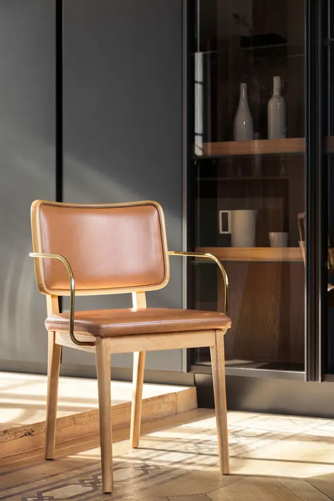 The Red Edition cane chair is nothing less than absolute comfort and familiarity. All the spirit of Parisian brasseries, cosy and elegant, is nestled in this chair which marries materials such as its polished, chic brass armrests with verve.The frame is made of natural or stained-black oak. The seat is made of either foam/leather or foam/fabric.Red Edition is able to customize your piece even with the leather or fabric of your own choosing, a service limited to a minimum of 6 pieces.MaterialsSolid oak frame in natural or black finish.Seat upholstered in leather or fabric.Brass armrest version available.The structure of the Wicker Chair is made of natural or black oak. The seat is made of foam/leather or foam/fabric.The wicker chair is available in two versions, with or without brass armrests.
