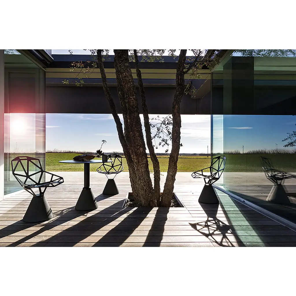 Magis’ Chair_One is an iconic, distinctive chair designed by Konstantin Grcic for Magis in 2003. Chair_One features a seat constructed of polygonal flat planes, just like a football – the pieces are assembled at angles to each other, resulting in a three-dimensional, curved shape. Made of cast aluminum with a concrete base, Chair_One is designed for both indoor and outdoor use. According to Konstantin Grcic, his design approach to Chair_One started as a mixture of naivety and bluntness, which eventually turned into an exceptionally dynamic and interesting geometric form. The pieces of the Family_One collection are real eyecatchers both individually or in groups, and thanks to their robust construction, they are equally well suited for domestic and contract use.
