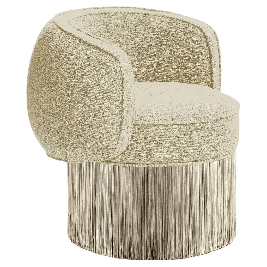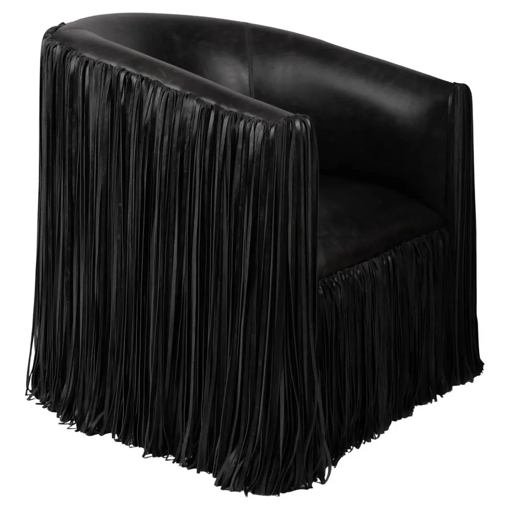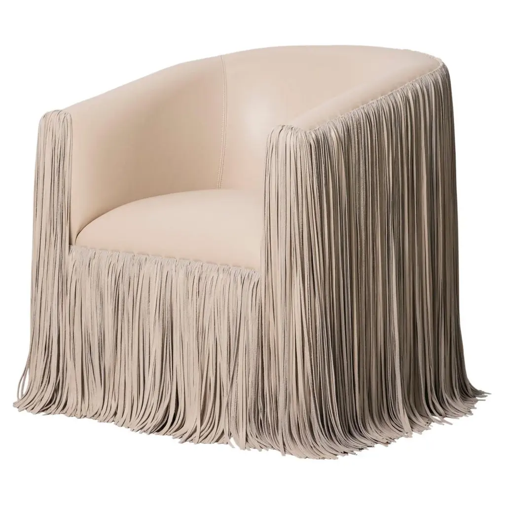 Handcrafted in Johannesburg, South Africa with draped strips of leather, creating a glamorous and luxe look. PRODUCT INFORMATIONDIMENSIONS: 30.5"W x 29.5"D x 32"HCOLOR: Cream-StoneMADE OF: Tanned Bovine LeatherMADE IN: Johannesburg, South AfricaCARE: Leather is a natural product and is therefore susceptilble to fading if exposed to direct sunlight and moistureCream-Stone Leather Color - Stock Supported.