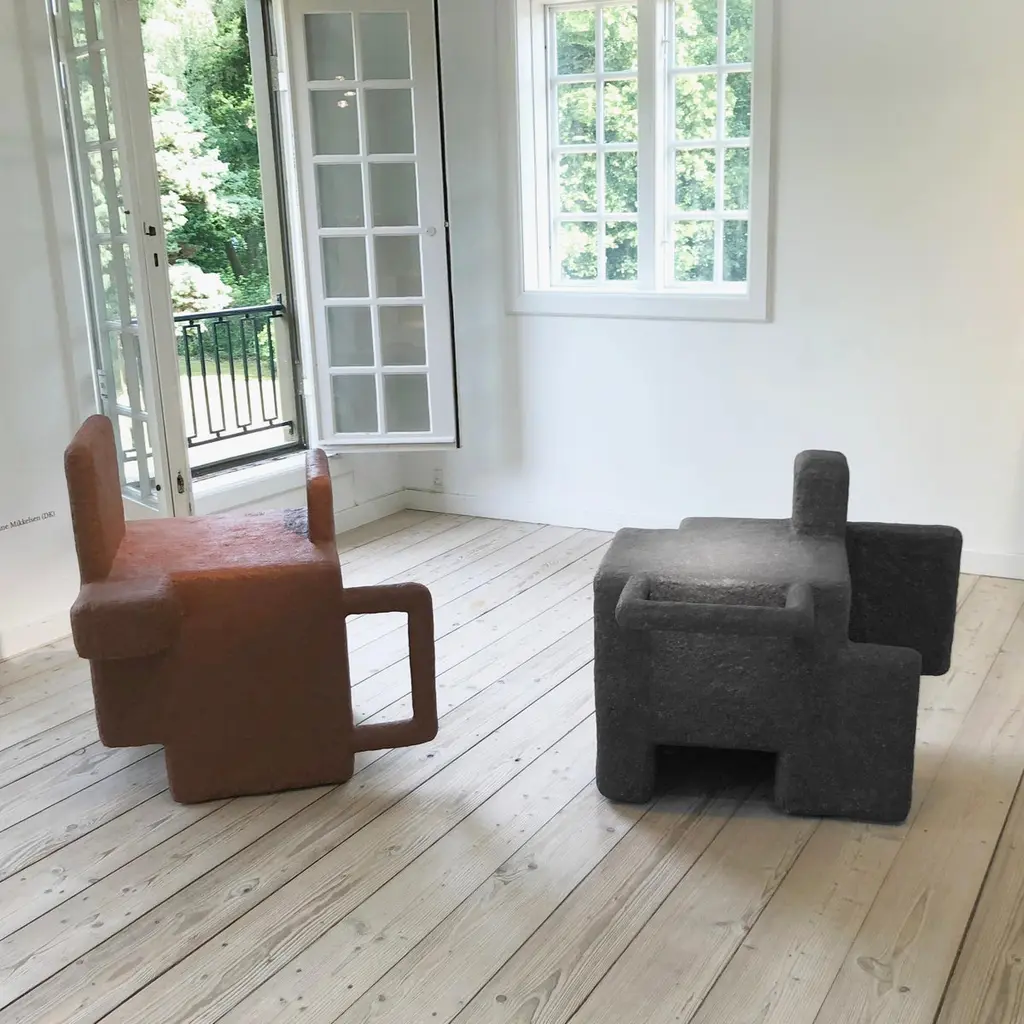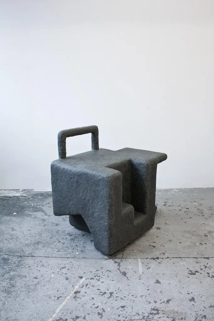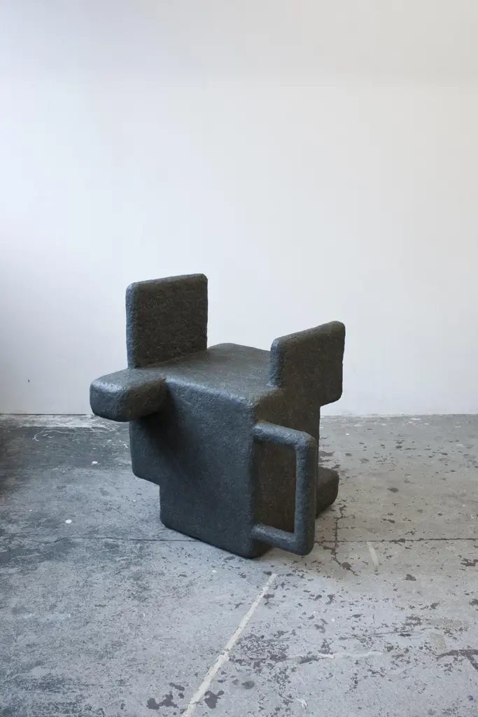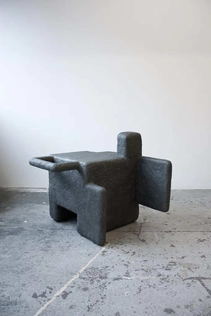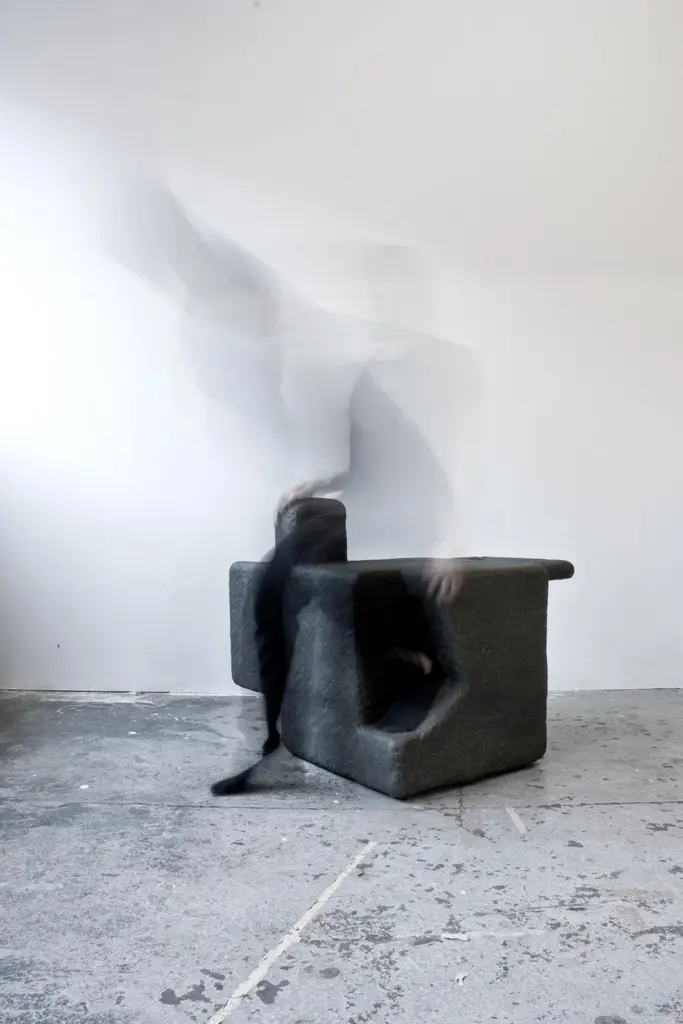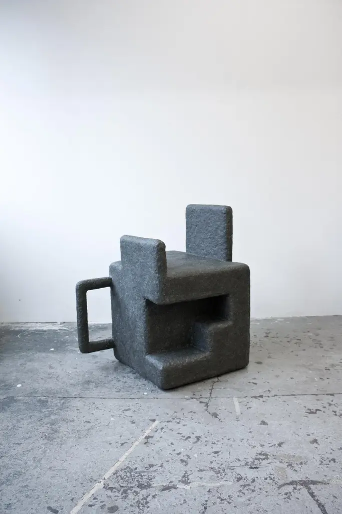 Chair "The Art of Sitting" by Stine Mikkelsen Dimensions: 75 x 75 x 85 cm Materials: Composite material based on crushed granite and fish glue. The inner construction is polystyrene.The concept behind The Art of Sitting is based on the quote by Gunnar Aagaard Andersen: ”In order to sit well, one must be able to sit differently.”The shape of the object is based on an investigation into how many different ways one can sit on a chair. The shape of the object has been found by identifying the surfaces where the body needs support.Gunnar Aagaard Andersen spent time investigating the square in his work. As Stine Mikkelsen is working with three-dimensional objects, the starting point for her project has been the cube.The objects are made of a composite material developed by the studio. It is based on crushed stone and fish glue, and is therefore a 100% natural material.Stine Mikkelsen is a Copenhagen-based material researcher and manipulatorworking within the field of experimental product design. With a background in textile design, materials have a primary role for her in boththe process as well as the final objects. Through challenging and refining methodsfrom this field, unexpected things occur which lead to new ways of making and producing. Through this, she not only challenges the way we understand textile andproduct design, she also modernises the notion of crafts.