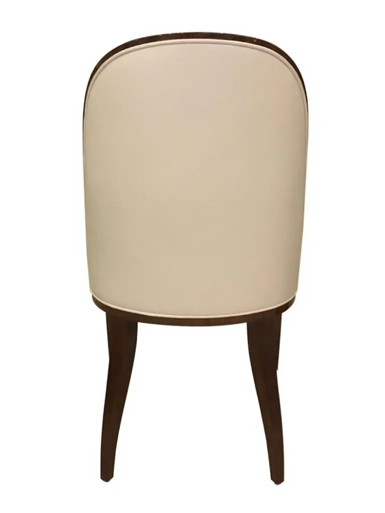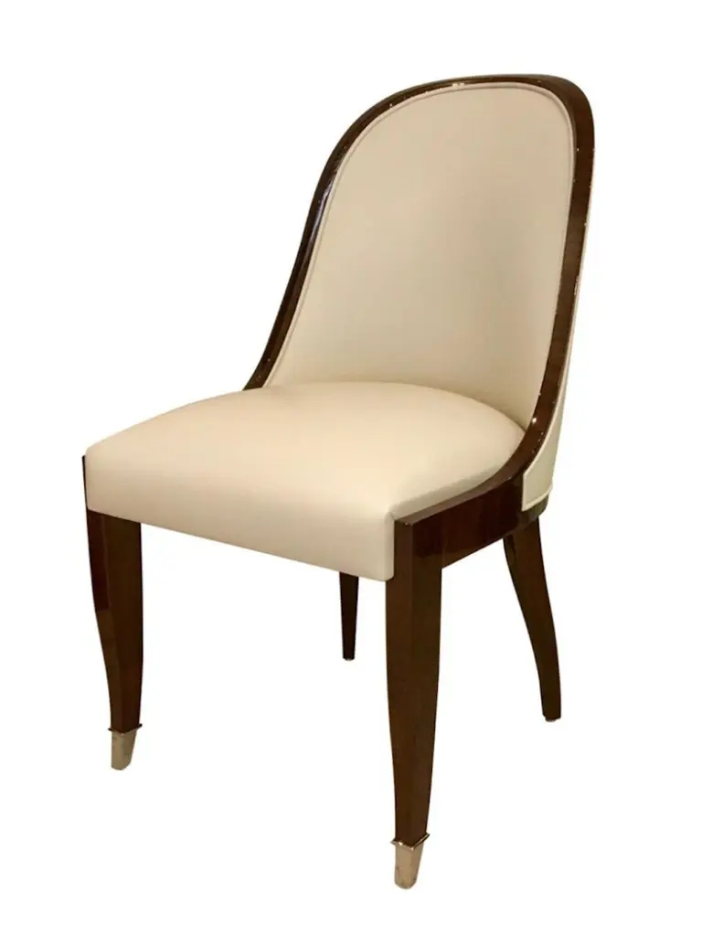 Elegant Art Deco chair with beautifully wide curved backrest. This is the most famous Art Deco chair shape. Very elaborate in production, offers excellent seating comfort. High quality! Handmade in Germany. Lacquered wood.Two metal shoes on the feet. Different upholstery, leather colors, woods, lacquer colors or surface finishes on request. Measurements:Width 51 cmHeight 95 cmDepth 61 cmSeat height 48 cm.