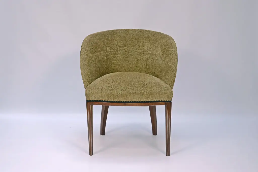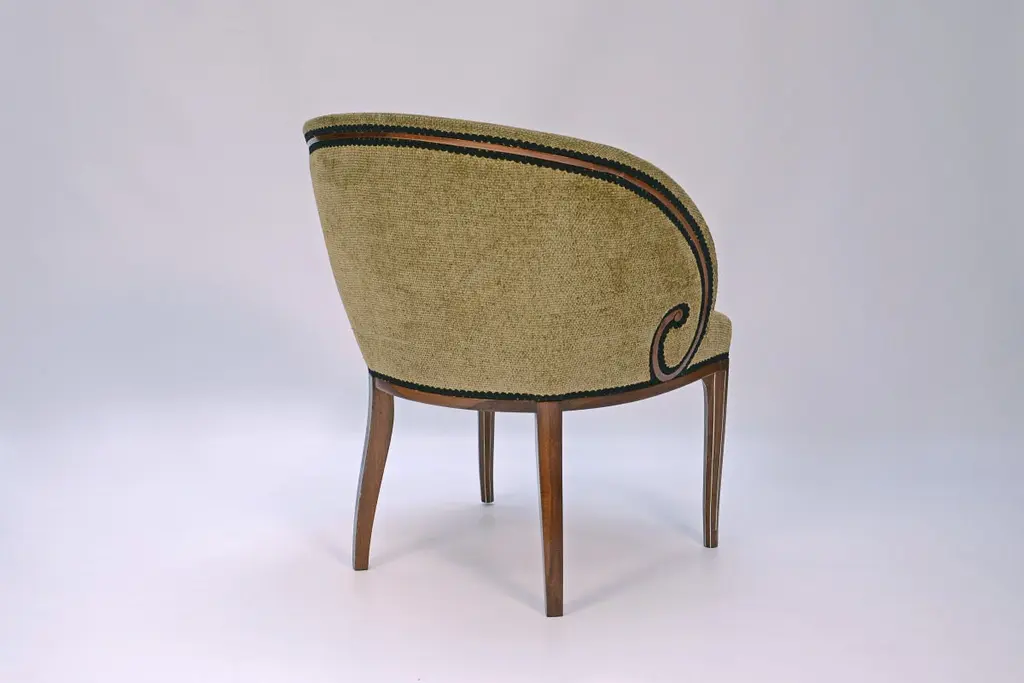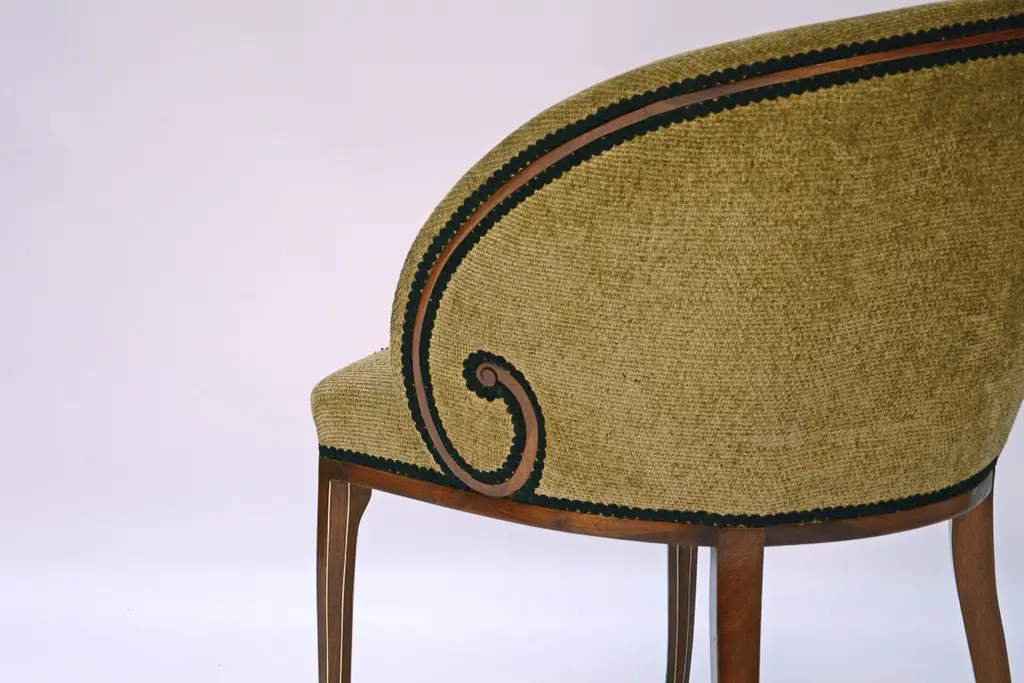 Set of 8 chairs designed by Jules Leleu (1883-1961). Walnut wood with inlay and chenille upholstery.Francoise Sirex (2008) "The House of Leleu: Classic French Style for a Modern World, 1920-1973" p. 157France, Circa 1920.