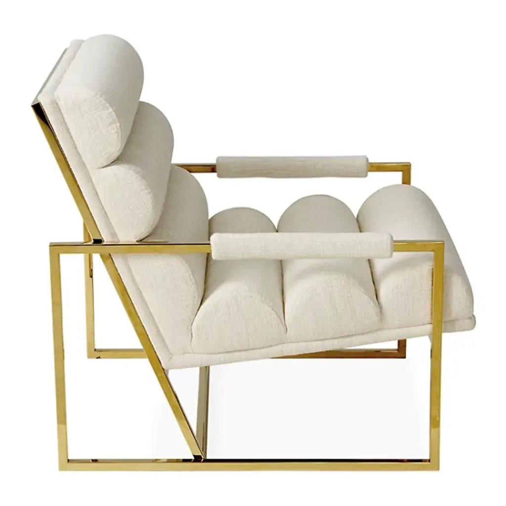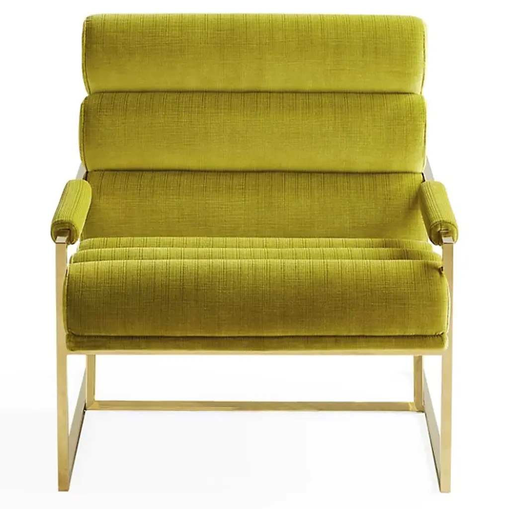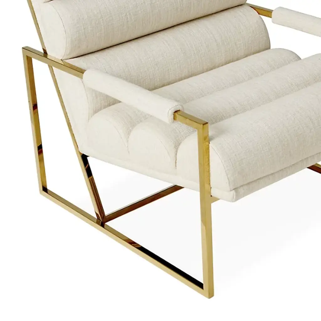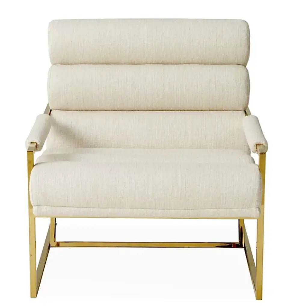 Luxurious stylings ensure the Channeled Goldfinger Lounge Chair from Jonathan Adler makes a lasting impression, relying on an angular brass frame and cozy cushions with a repeating semicylindrical pattern to capture the eye. Designed following Adler’s guiding philosophy of, "If your heirs won’t fight over it, we won't make it," the chair incorporates an inset, angular back structure that adds a stylish counterpoint to the retro glamor of the construction.
