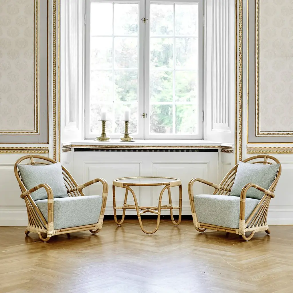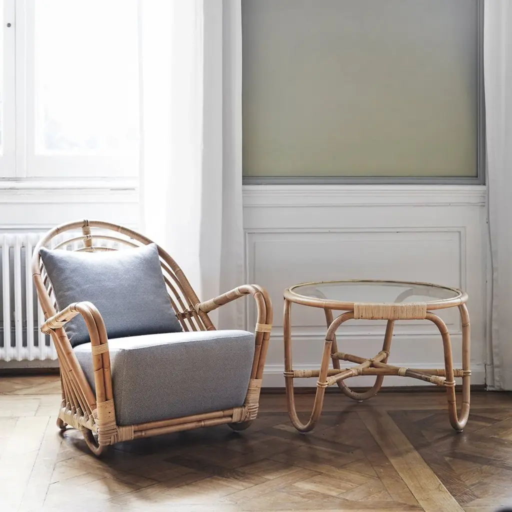 The AJ-25-SU Charlottenborg Lounge chair is designed by Arne Jacobsen and handmade in Indonesian sustainable rattan. The chair is made in the colour natural which is original and suitable for every occasion. The fine bindings in the seat and back are made by skilled wicker workers. This charismatic armchair was designed by Arne Jacobsen in 1936 and shown for the first time at Charlottenborg's spring exhibition in 1937. Originally called the Chair AJ 237 and was part of a series of original wicker chairs. The curving shapes became very characteristic of Arne Jakobsen's many famous chair designs, which can be traced in some of his early pieces of furniture. The armchair has a quite unconventional shape, where the elegant curved back of solid rattan goes in one with the armrests, both of which are beautifully integrated into the bottom of the chair. In addition to the rattan frame, the chair is fitted with a firm padded seat that comes in many different durable fabric variants. The elegant and comfortable chair is a beautiful contribution to any modern sofa. In fact, the Charlottenborg chair was reportedly Arne Jacobsen's favourite armchair in his famous cottage on the Bay of Sails. The chair is made in the material Manau & Tohiti. A cushion can be purchased for the back in any optional fabric, sewn on our Danish sewing department. We also offer to sew cushion in your own fabric, please contact us for more information about material use.