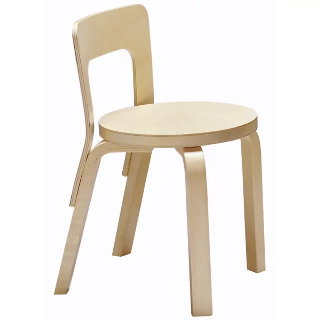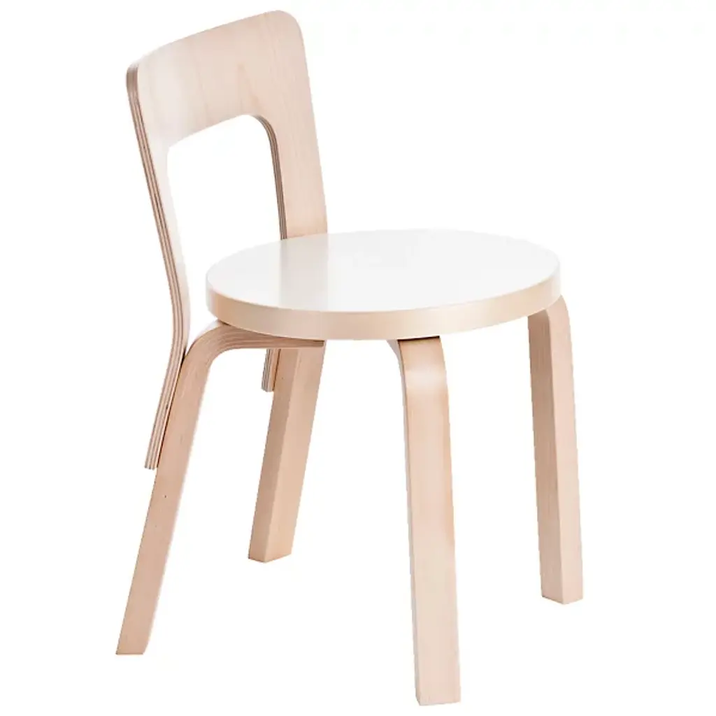 A chair that's perfect for pint-sized modern design lovers. The Artek Children's Chair N65 is a scaled-down version of Alvar Aalto's Chair 65 (which was in turn inspired by his Stool 65). It features Aalto's signature L-legs, lengths of birch strategically bent for stability and strength to support the round seat. The look is finished off with a bent plywood back.