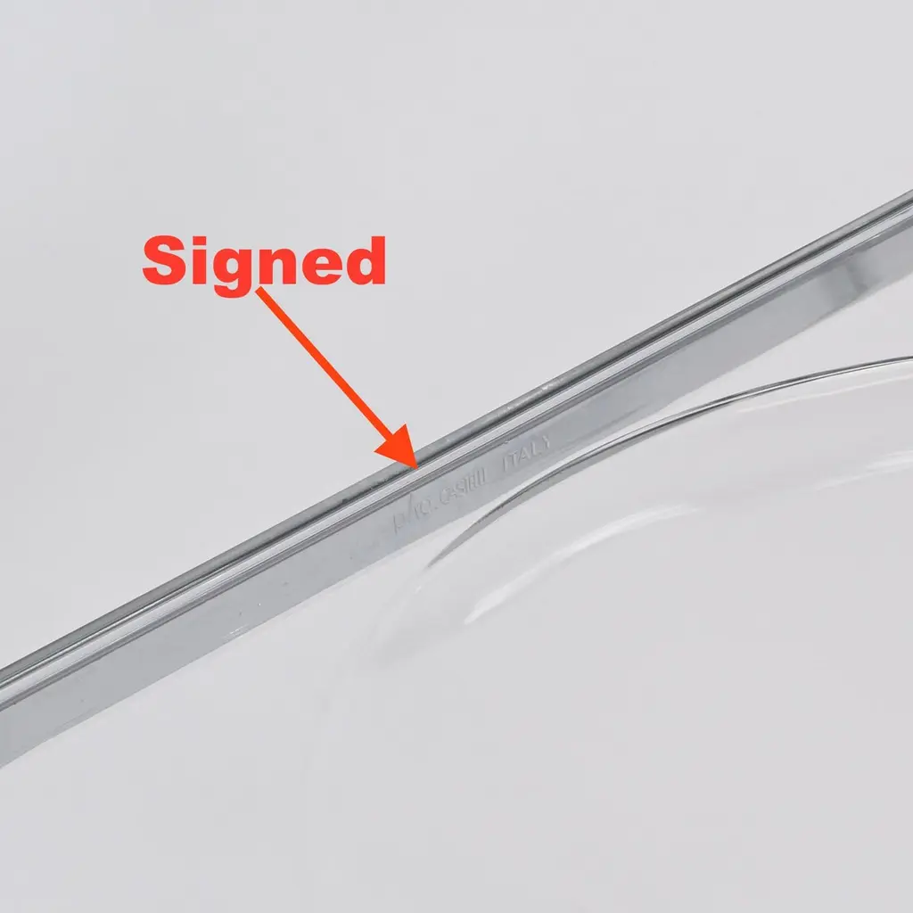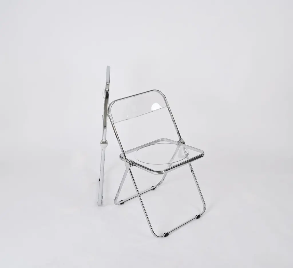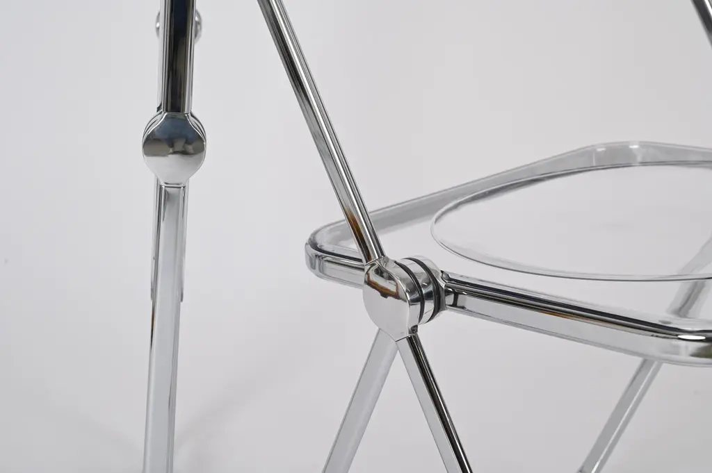 Original and signed "Plia" folding chairs in clear lucite with chrome frame. This fantastic chair was designed by Giancarlo Piretti for Castelli in 1967. These folding chairs are made in an elegant clear lucite with a chromed frame and are in perfect conditions (NOS), with no flaws and come with their original box. The "Plia" folding chair is a true design classic as it has won several awards and is also part of the MoMA collection. The "Plia" chair has a fantastic folding mechanism which allows the chair to be folded very flat so that it can be stored easily. Each chair in this set is signed and engraved with the manufacturer's mark.A multipurpose and iconic set that will be perfect for a modern or minimal project. Giancarlo Piretti was born in Bologna in 1940.He attended the Bologna State Institute of Art, where he obtained the title of Design Teacher. In 1960 he attended the Academy of Fine Arts in Bologna. Subsequently, for seven years, he was lecturer in Industrial Design at the State Art Institute of Bologna. In the same period, for 12 years, he worked as an interior designer for Anonima Castelli, designing their lines of furniture for the home, office and community, for which he registered numerous industrial and mechanical invention patents. His best-known projects include PLIA, a folding chair, PLATONE, a folding table, DSC (106-AXIS), a seating system for community and institutional spaces, and SISTEMA 61, a modular sofa system. Giancarlo Piretti participates in numerous Italian design competitions, obtaining prizes and special mentions. In 1971 he received the SMAU award and the BIO 5 Distinction at the Ljubljana biennial, Slovenia for Plia. In 1973 he was awarded, as always for PLIA, the GUTE FORM mention by the Chamber of Commerce of the Federal Republic of Germany, and a special mention by the British Government. In 1971 PLANO won the IBD gold medal (USA). For the VERTEBRA seating system: in 1977 he was awarded, together with Emilio Ambasz, the gold medal of BD (USA), the SMAU prize in 1979 and the Compasso d'Oro (Italy) in 1981. As always jointly with Ambasz, in 1980 he was awarded the "National Industrial Design Award" (USA) for LOGOTEC, a lighting system. In 1975 Giancarlo Piretti was appointed member of the Scientific-Didactic Committee of the Higher Institute for Artistic Industries of Florence. His work is often published in numerous international journals.