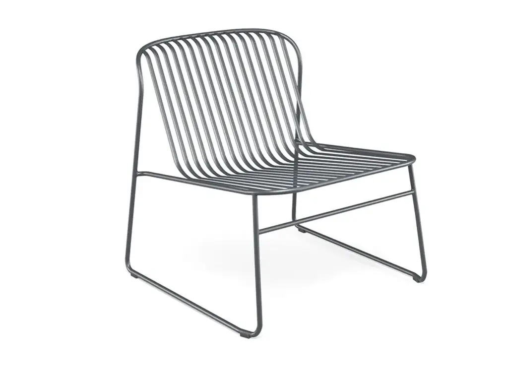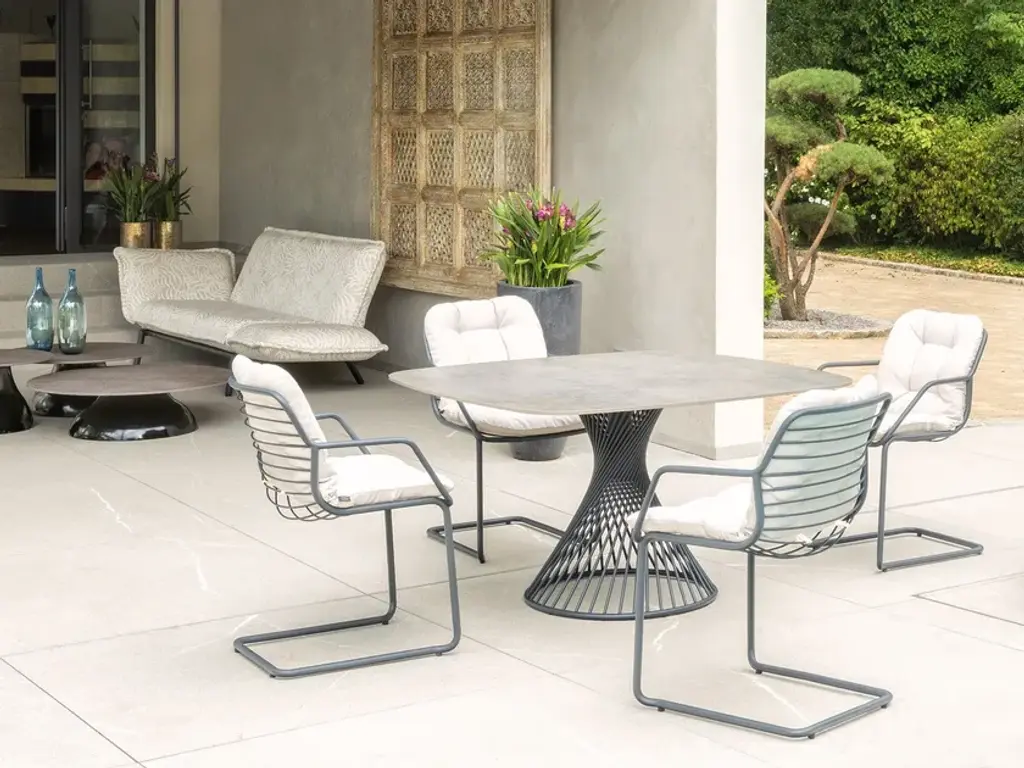 CLARIS is a lightweight, stackable, and surprisingly comfortable outdoor swingchair. Moreover, made only of a particularly weatherproof and virtually maintenance-free material: Stainless steel, powder coated in dark bronze or anthracite. An armchair that does not impose itself by its transparent form but elegantly fits into the outdoor area. Comfort is provided by the quilted cushions for the seat or seat-back.The chair is a solitaire which, thanks to its clear shape, fits many of the tables on offer. The CLARIS tables are like sculptures with the unique design and are available in many sizes.