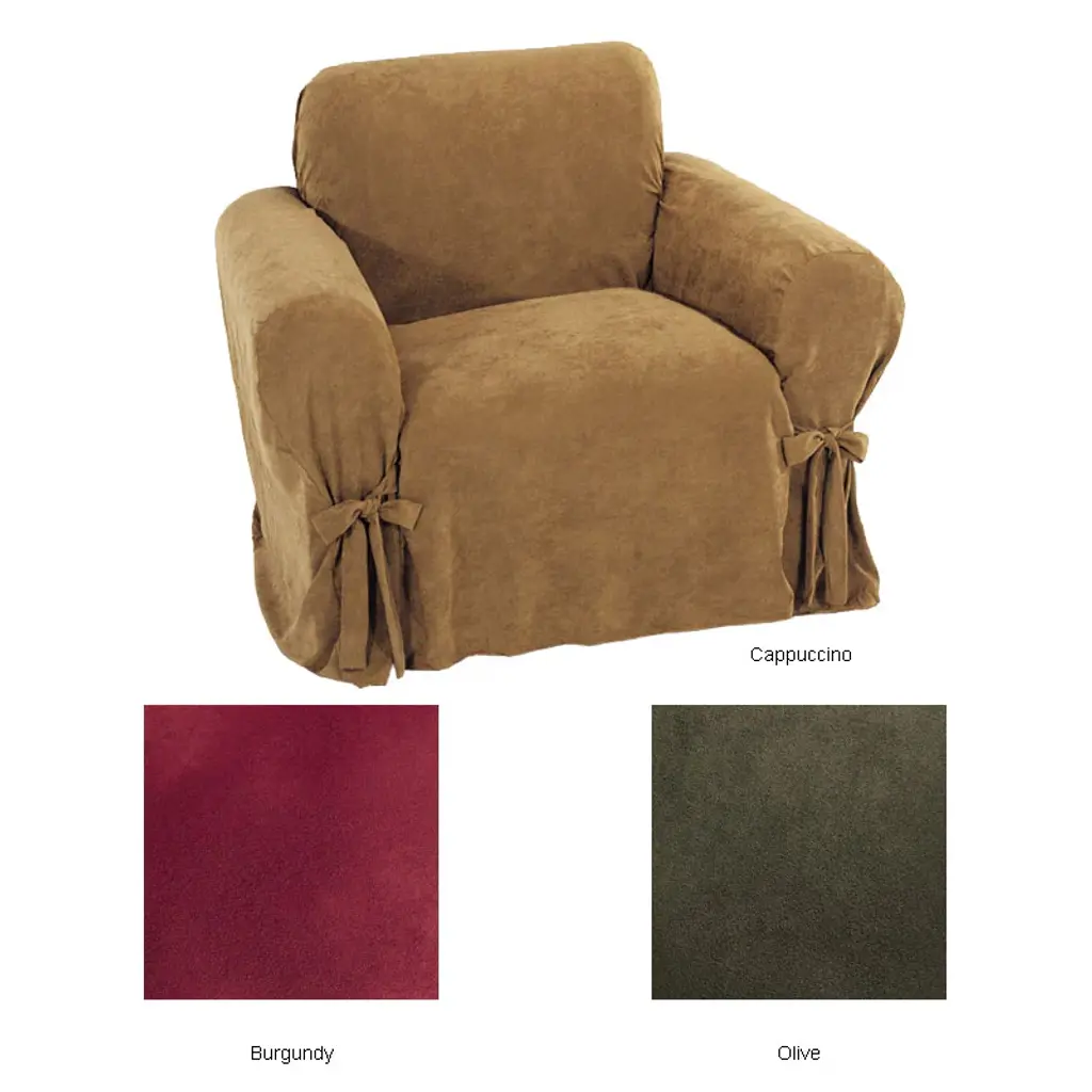 Give your home decor an instant update with this easy to use cover Ultimate suede slipcover boasts exceptional softness and drape Furniture cover in rich, contemporary colors Available in Olive, Cappuccino, Blue, and Burgundy color options Chair fits 32 inches to 40' wide x 36' in height 114 inches from bottom front to the bottom back 100-percent polyester Machine washable