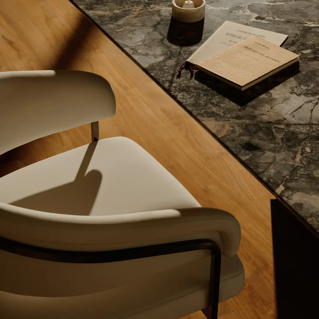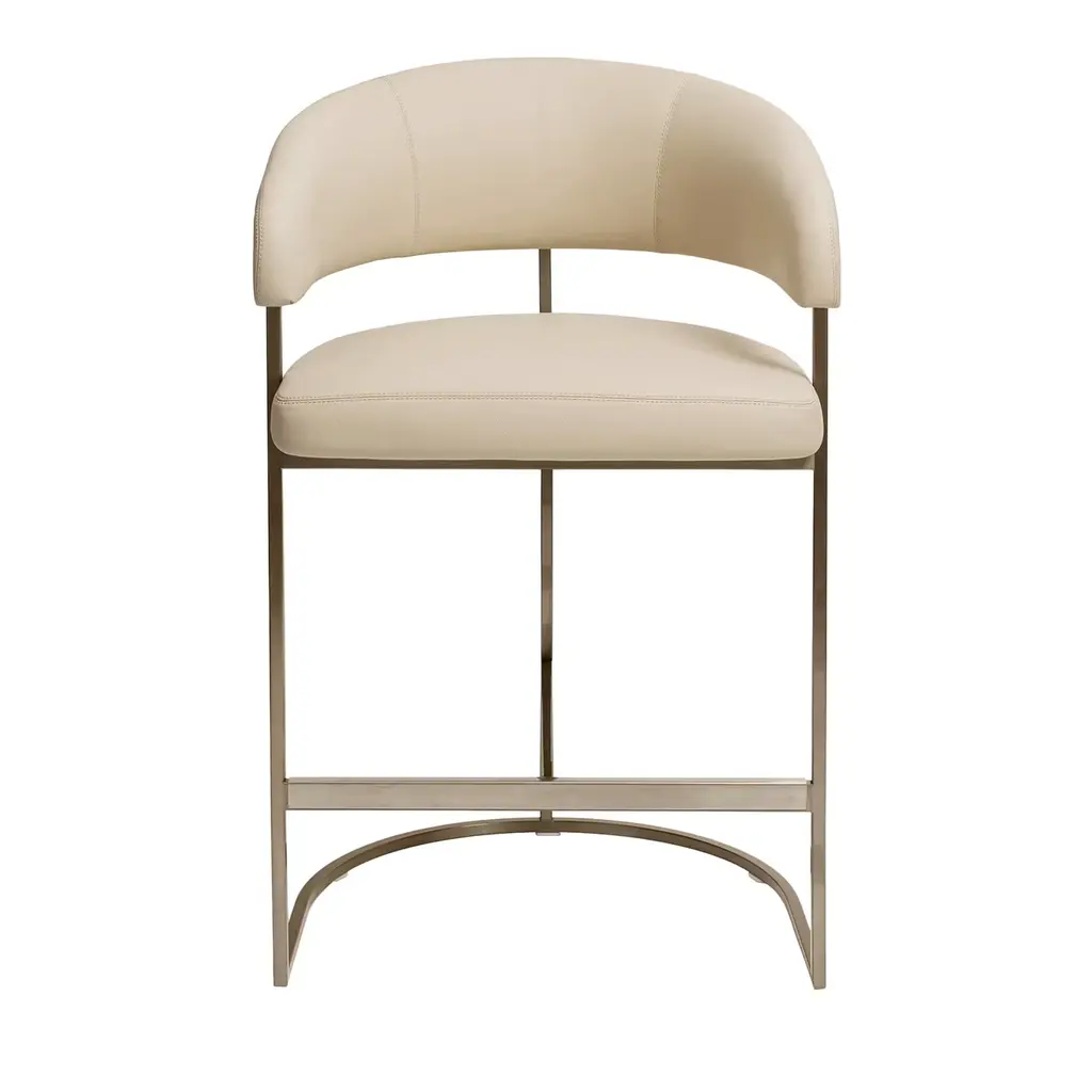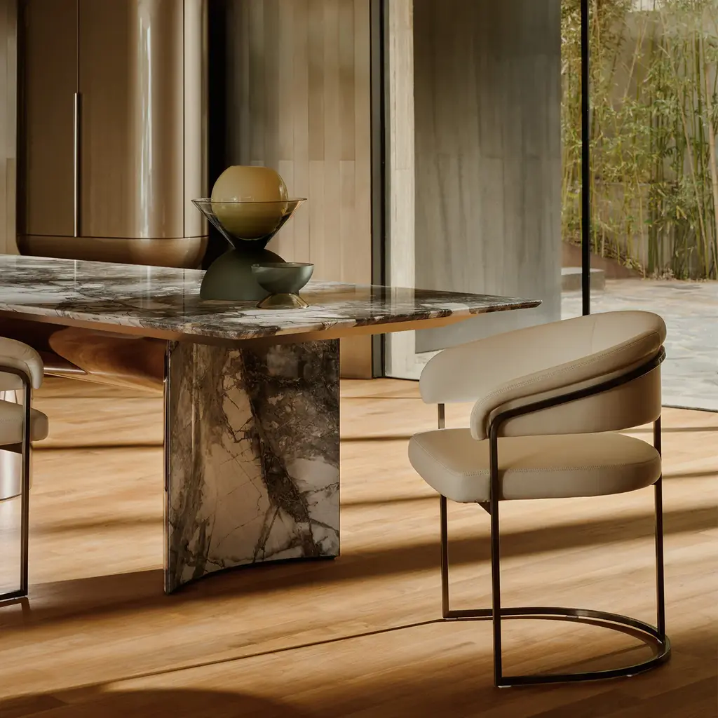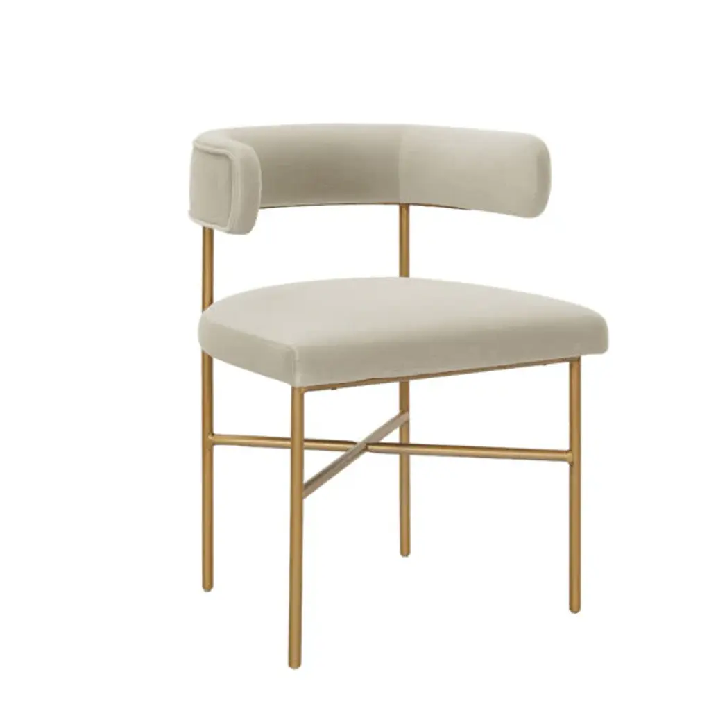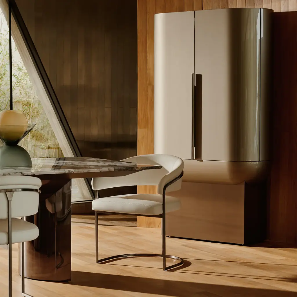The Clem chair features a frame crafted from squared brass pipes, engraved with the Visionnaire logo. The seat structure and backrest are made from curved plywood, padded with varying densities of polyurethane and acrylic fiber for comfort. The fixed upholstery is in Augusta fabric, beige, with metal parts finished in champagne satin for a refined look.