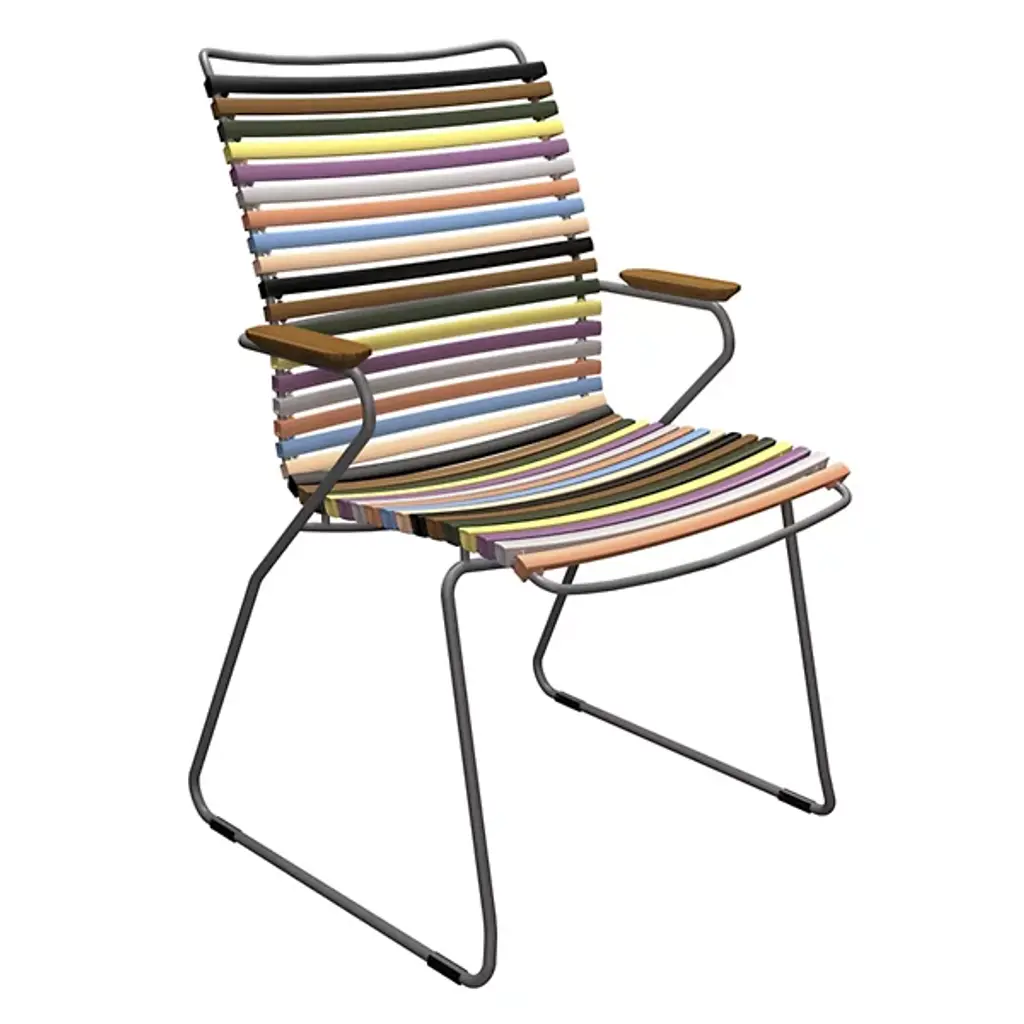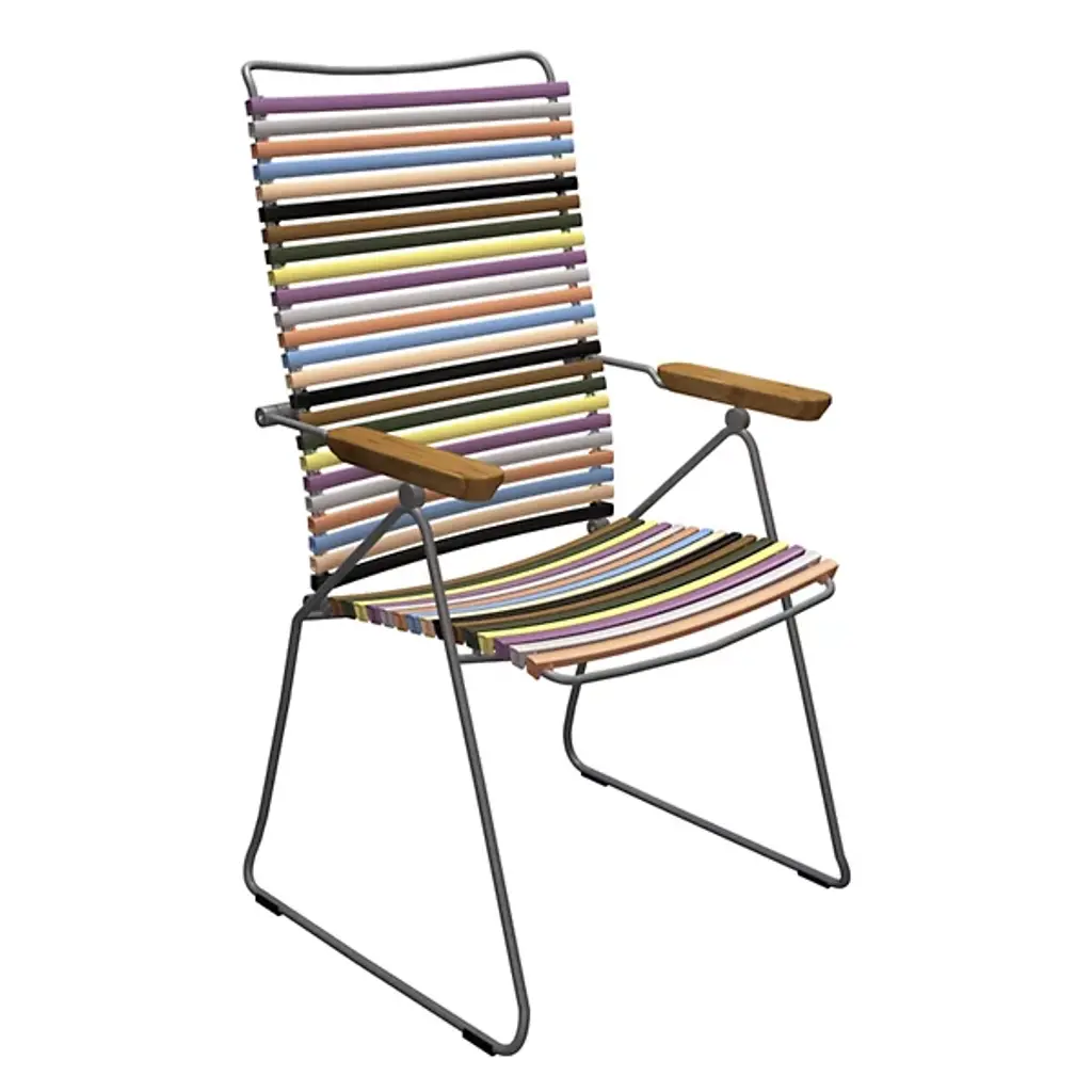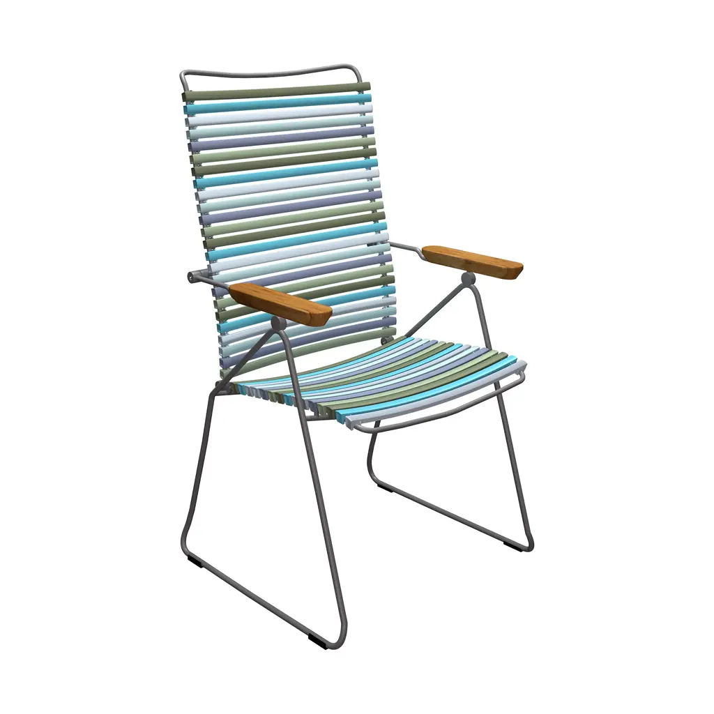 The Click Position Outdoor Chair with Armrest from Houe puts one in a position of airy comfort for an ideal time spent outdoors. The chair recalls classic outdoor furnishings in its slatted design. Here, the backrest slats let air pass through while supporting one with a subtle bend to them. The backrest lets one adjust their leaning position at 7 settings. A strong metal framework sets a strong foundation while remaining visually light. Bamboo armrests reference the warmth of the outdoors while providing an ideal for resisting the elements and regular use.