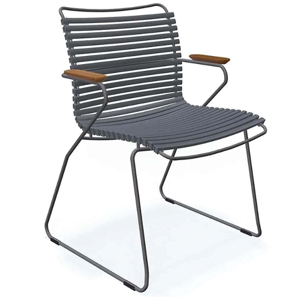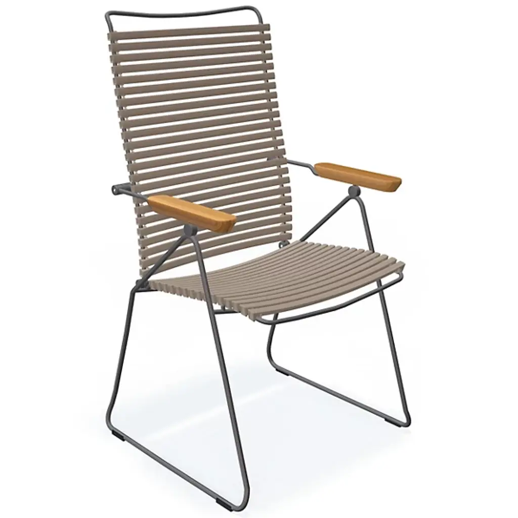 The Click Position Outdoor Chair with Armrest from Houe puts one in a position of airy comfort for an ideal time spent outdoors. The chair recalls classic outdoor furnishings in its slatted design. Here, the backrest slats let air pass through while supporting one with a subtle bend to them. The backrest lets one adjust their leaning position at 7 settings. A strong metal framework sets a strong foundation while remaining visually light. Bamboo armrests reference the warmth of the outdoors while providing an ideal for resisting the elements and regular use.
