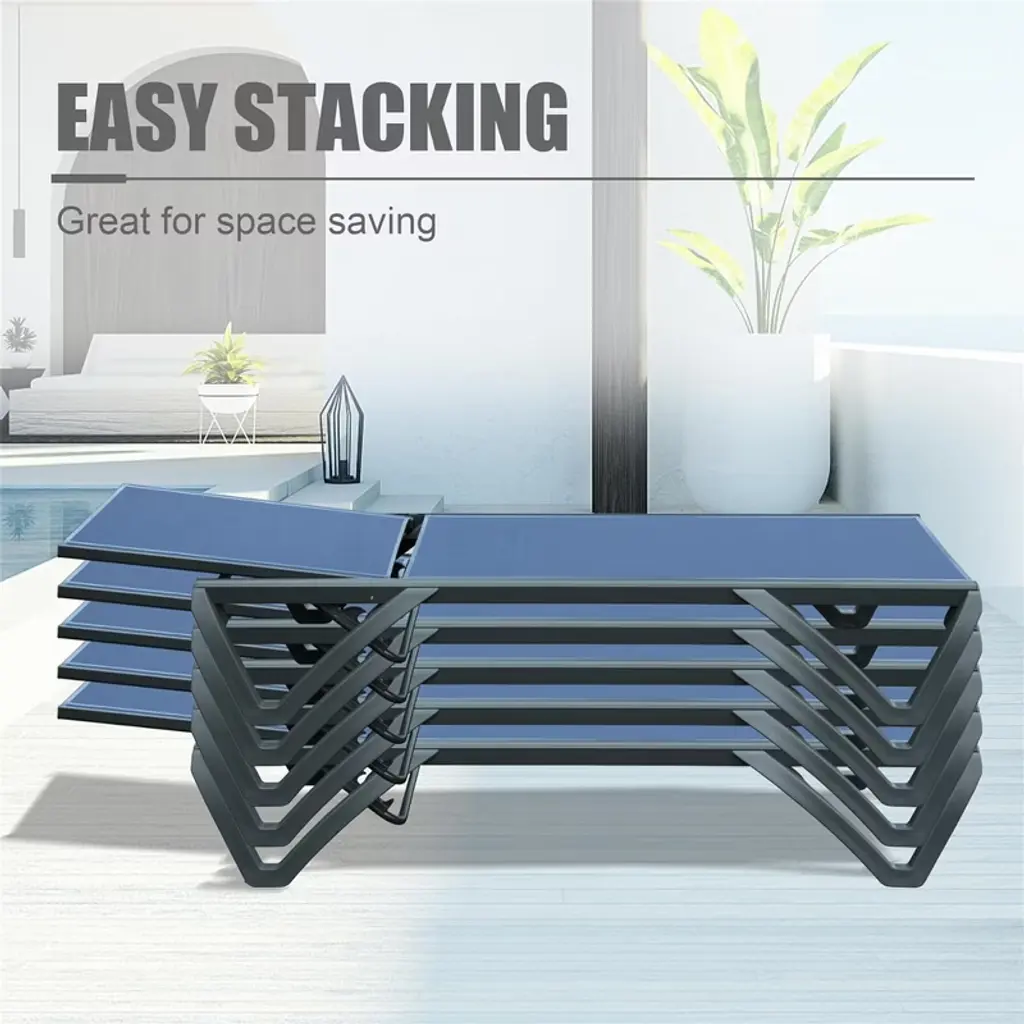 Relax in style with this modern outdoor lounge chair set. Featuring a durable rust-resistant aluminum frame, breathable quick-dry Textilene fabric, 5 adjustable reclining positions, and easy-to-move stackable design, it delivers lasting comfort and convenience for any patio, poolside, or garden.