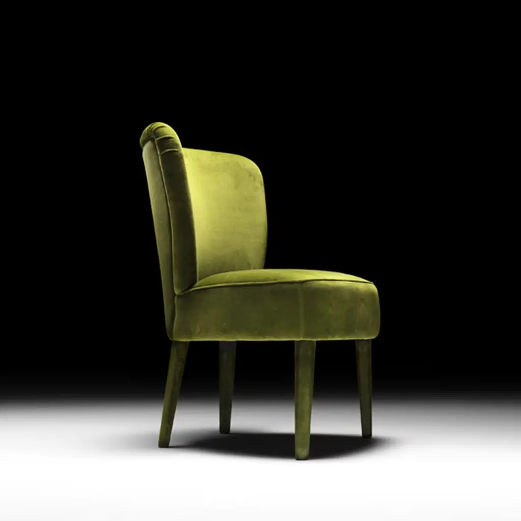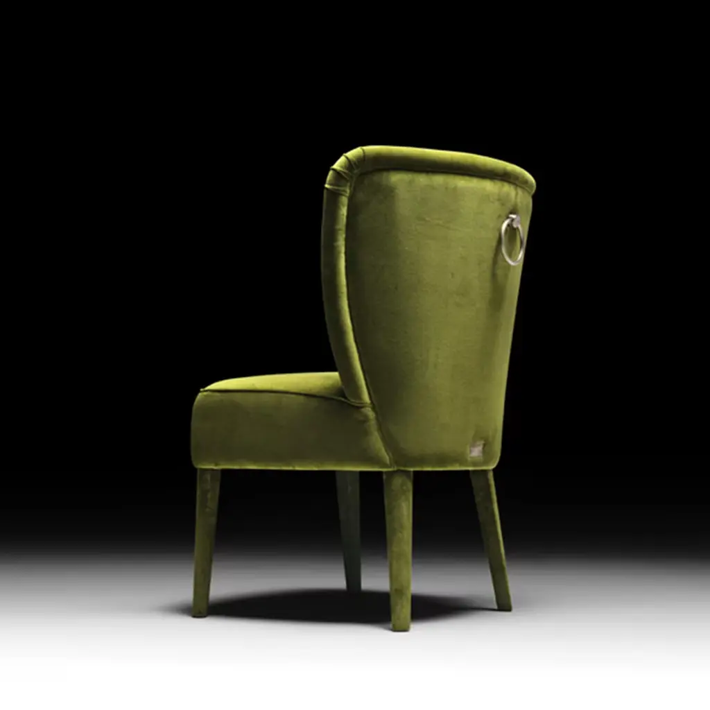 The elegant silhouette of this chair exudes comfort and relaxation. Resting on a beechwood structure, the seat and back are fashioned of fire-resistant polyurethane. The whole chair, including the feet, is covered with a captivating green fabric upholstery that is non-removable. There is the option of adding a bronze back handle with a matte finish, please ask the Concierge for details. Contract and commercial certifications available upon request.