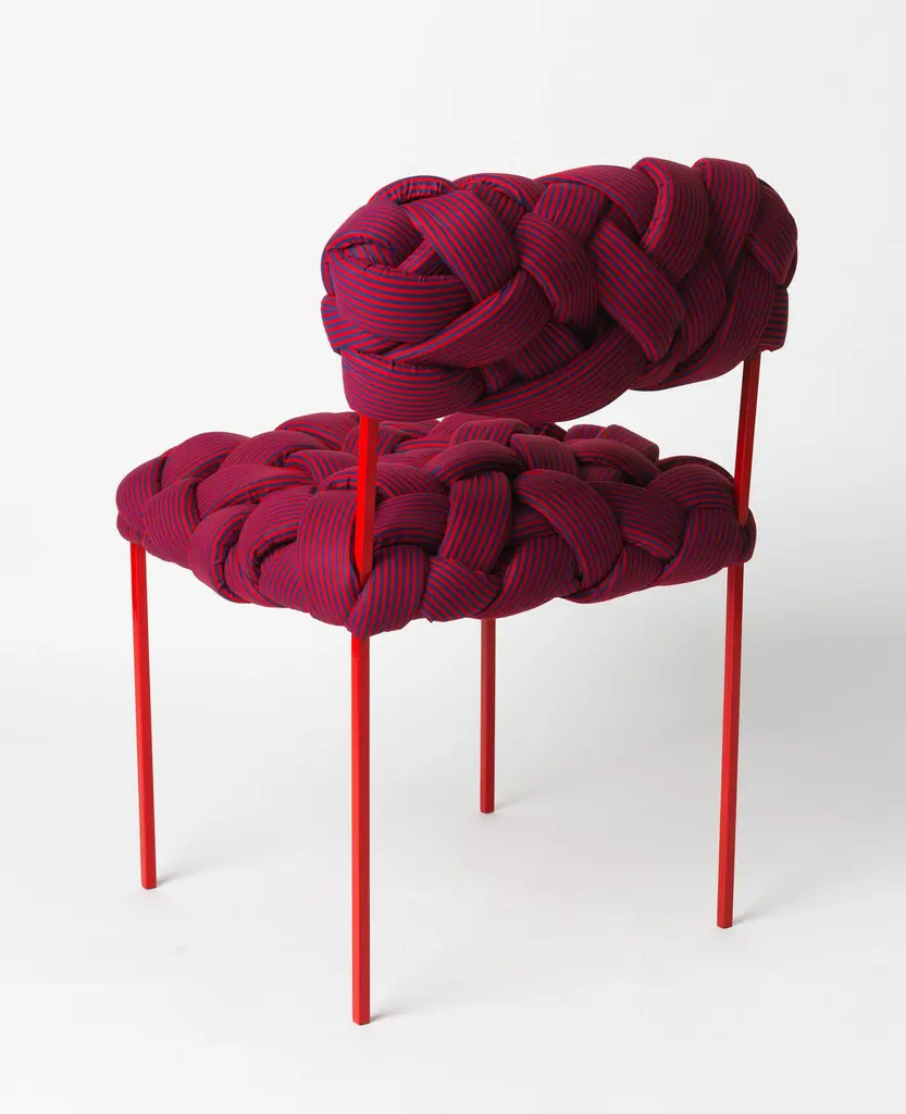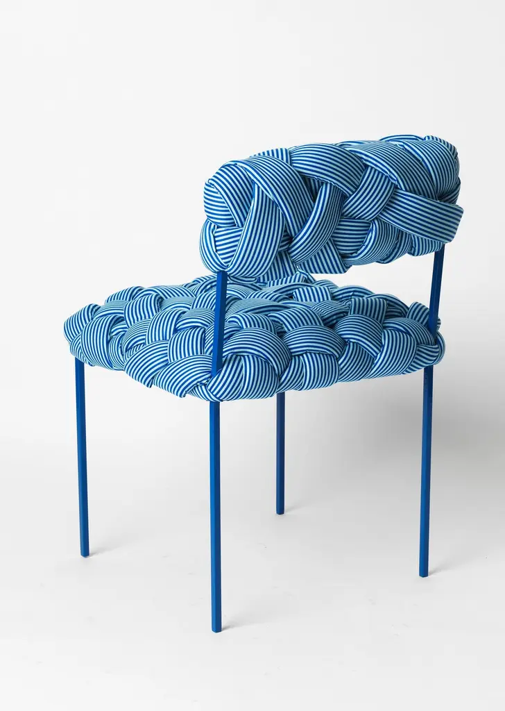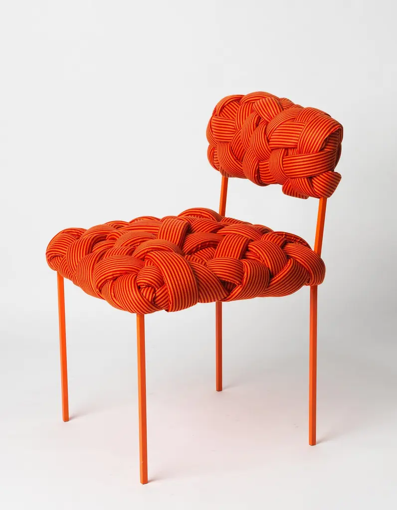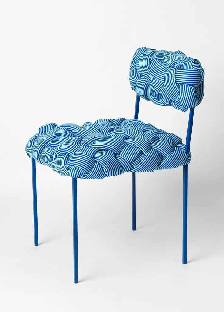 This contemporary chair is part of the Cloud collection, which was created around the concept of trees. These contemporary stools and benches are made with cotton fabric and foam stripes, woven and stitched by hand. Each piece is unique, as the result of the manual process to fabrication. Dimensions may vary within a 5cm limit due to manual manufacturing process.