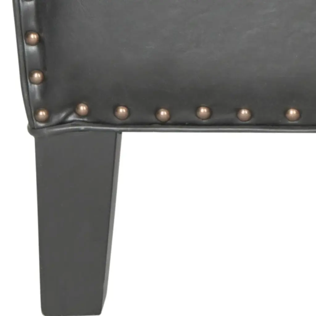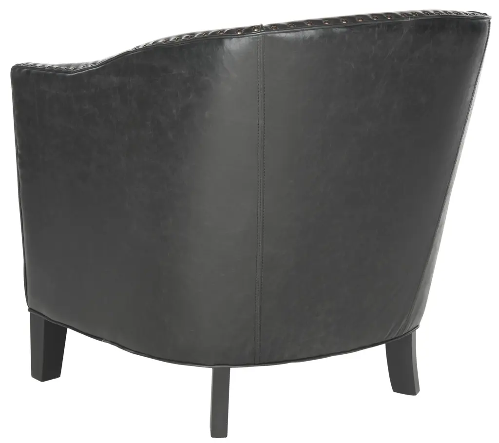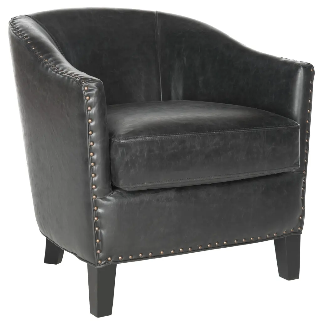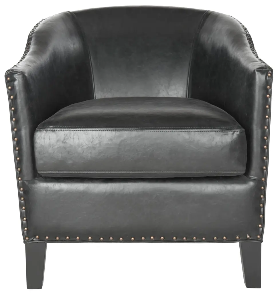 A transitional update of the classic tub chair, the antique black club chair is Brim With sophistication—and curves. Artfully upholstered in PU leather, this comfortable chair is detailed with brass nailhead trim and black birch legs. To prevent overall soiling, frequent vacuum light brushing is recommended. Cushions and pillows should be turned on a weekly basis. Down-filled cushions should be brushed rather than vacuumed. Spot clean, using a mild water-free solvent or dry cleaning product. Only a professional cleaner should undertake a complete overall cleaning. The use of steam or water-based cleaners may cause excessive shrinking or staining.