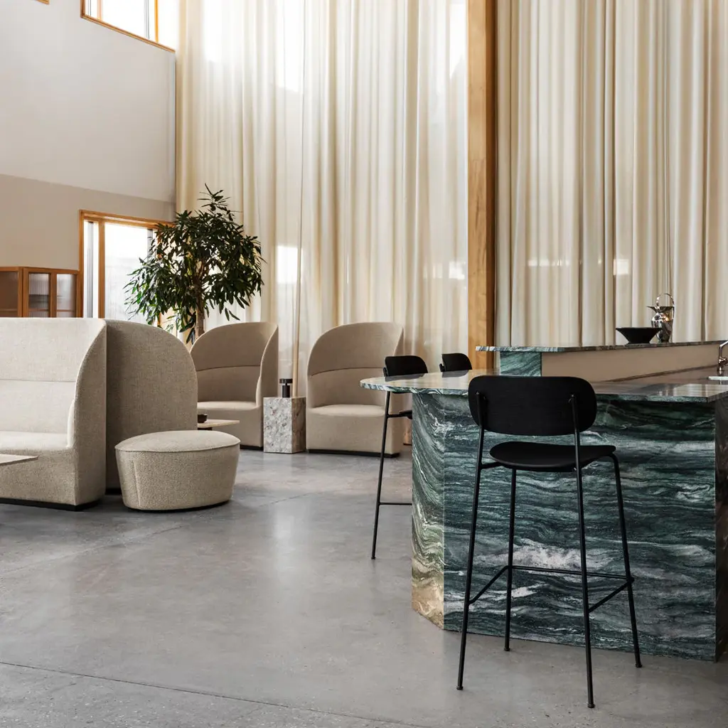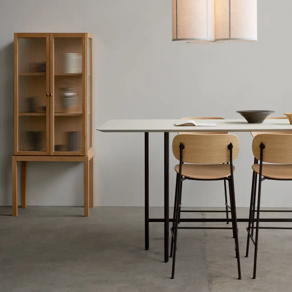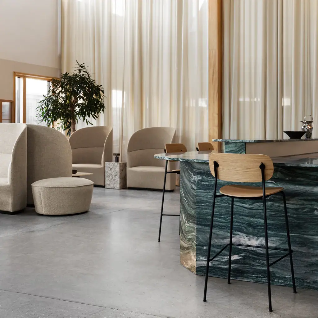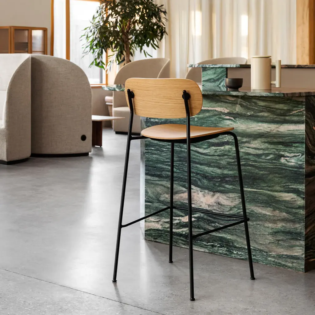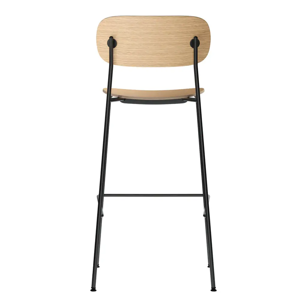 Distinguished by its wide back, generous seat and slender frame, the Co Bar Chair is equal parts comfortable and elegant. Conceived in collaboration with Norm Architects and Els Van Hoorebeeck, the elevated design features a footrest for additional support as you sit.