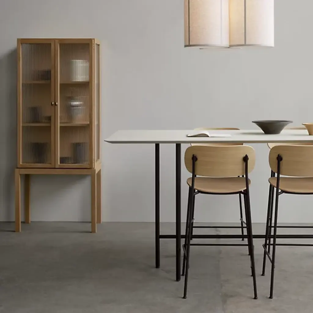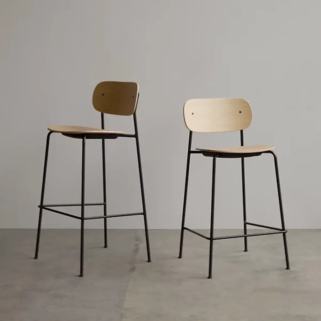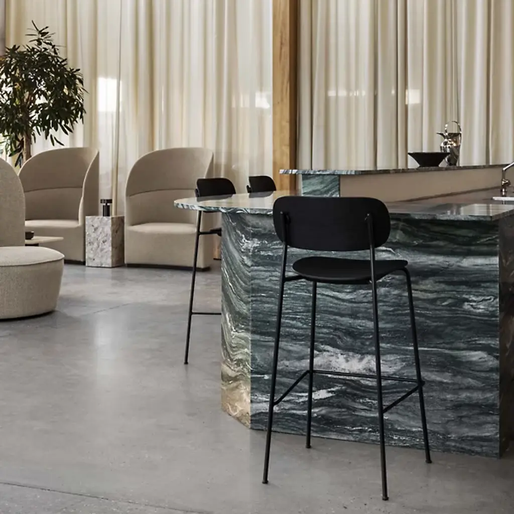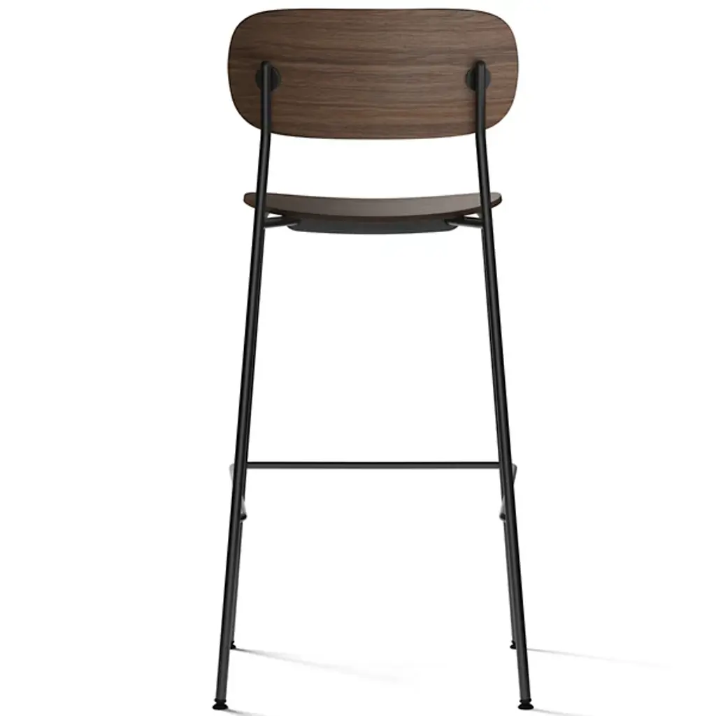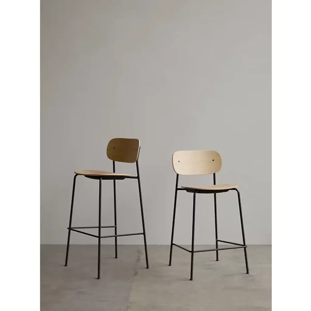 The Co Bar/Counter Chair, Non-Upholstered from Audo Copenhagen, formerly Menu, allows you to survey your surroundings from an elevated perch. A memorable design collaboration between Norm Architects and Els van Hoorebeeck, it starts strong with an open frame of powder-coated steel that is slender but not spindly, and further reinforced by a bracket-style foot bar. Its curving seat and back are made from beech core plywood, softened by an oak veneer that adds depth and naturalism to the otherwise minimalist design.