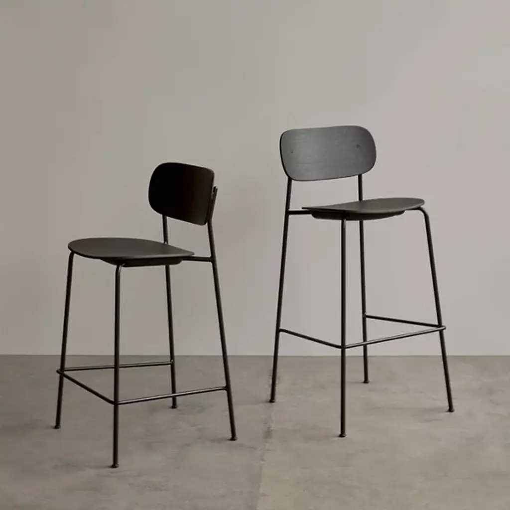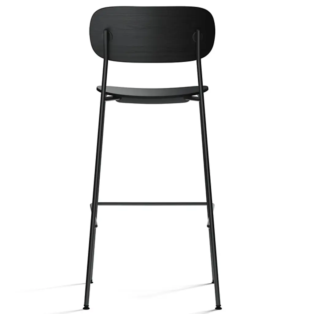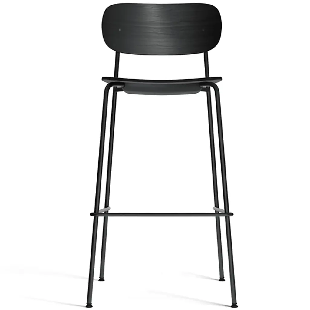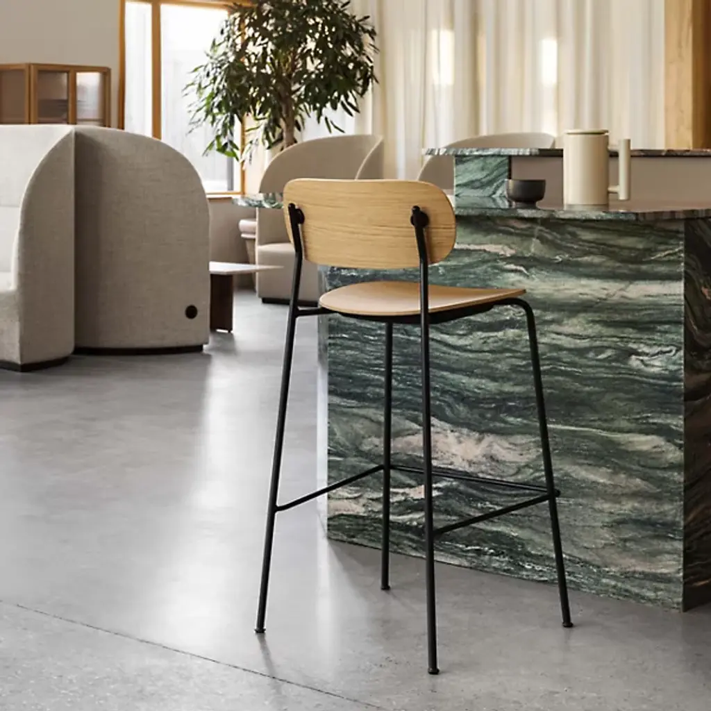 The Co Bar/Counter Chair, Non-Upholstered from Audo Copenhagen, formerly Menu, allows you to survey your surroundings from an elevated perch. A memorable design collaboration between Norm Architects and Els van Hoorebeeck, it starts strong with an open frame of powder-coated steel that is slender but not spindly, and further reinforced by a bracket-style foot bar. Its curving seat and back are made from beech core plywood, softened by an oak veneer that adds depth and naturalism to the otherwise minimalist design.