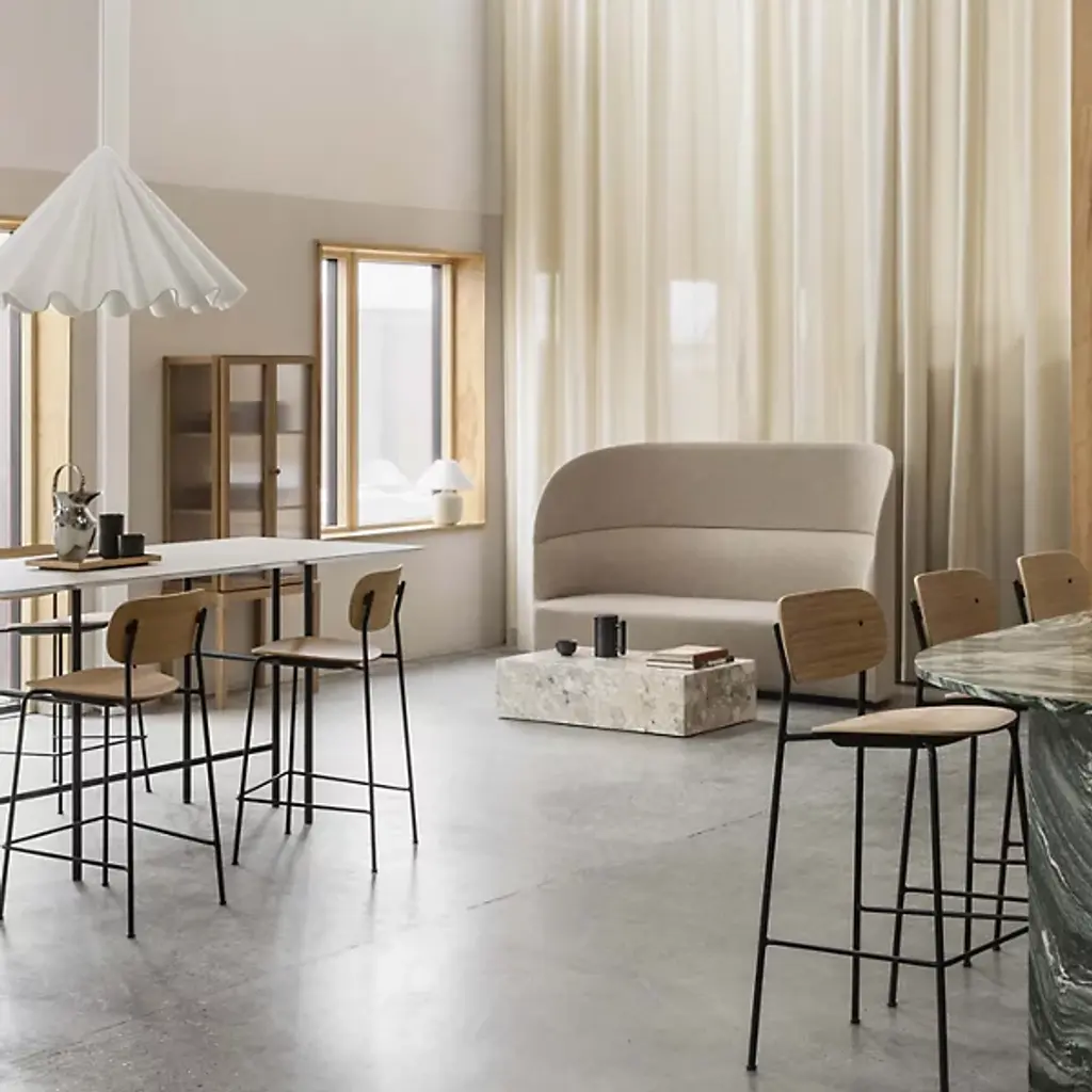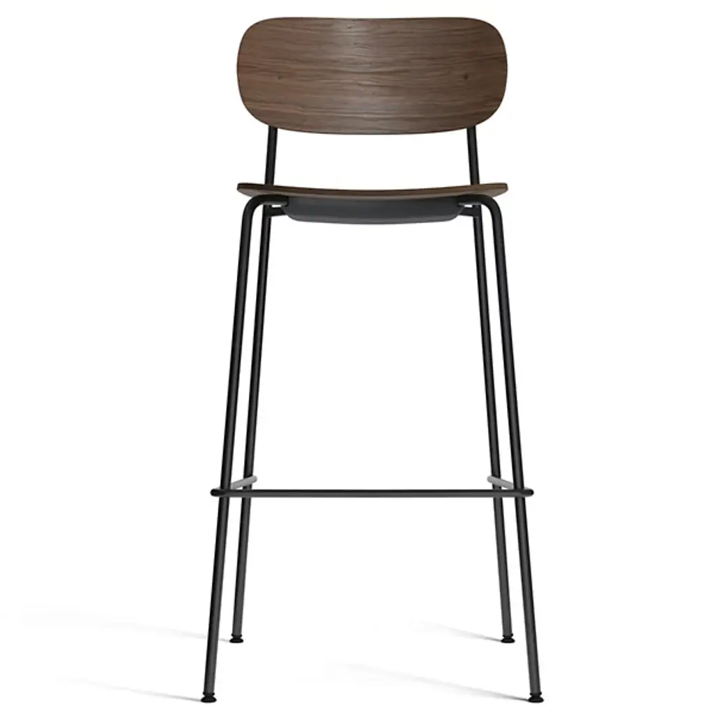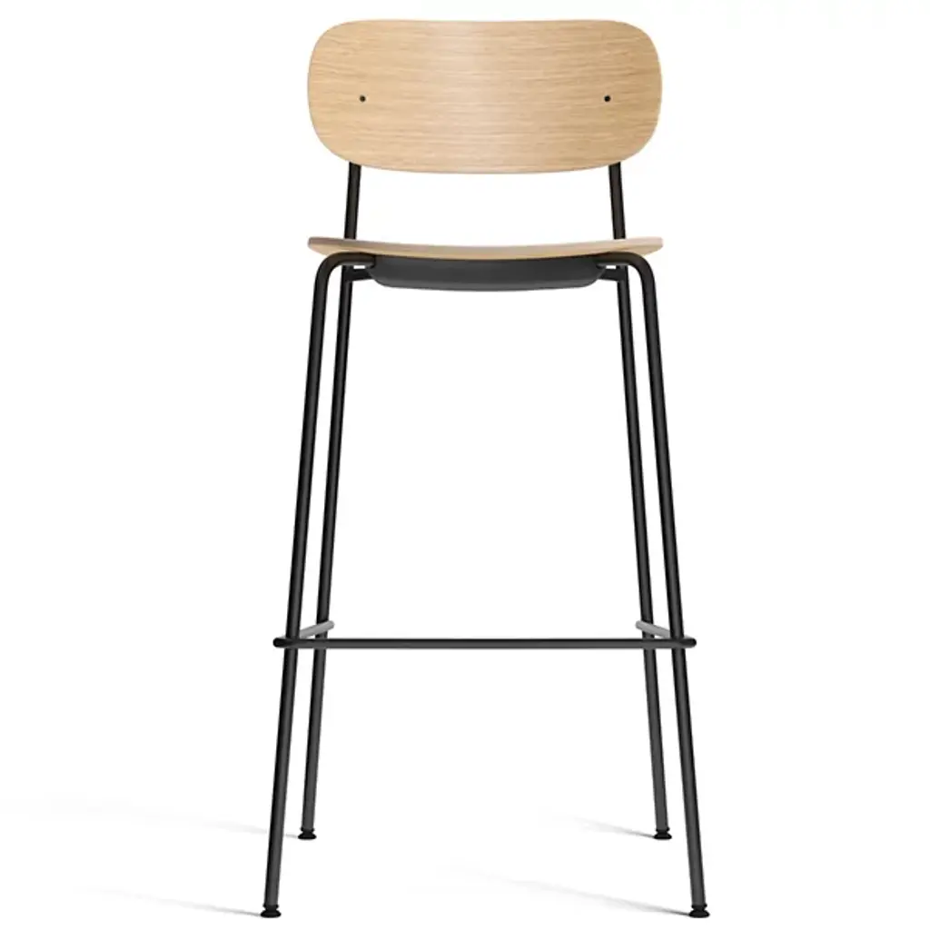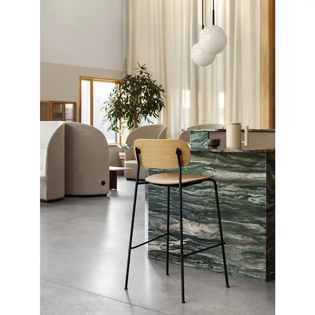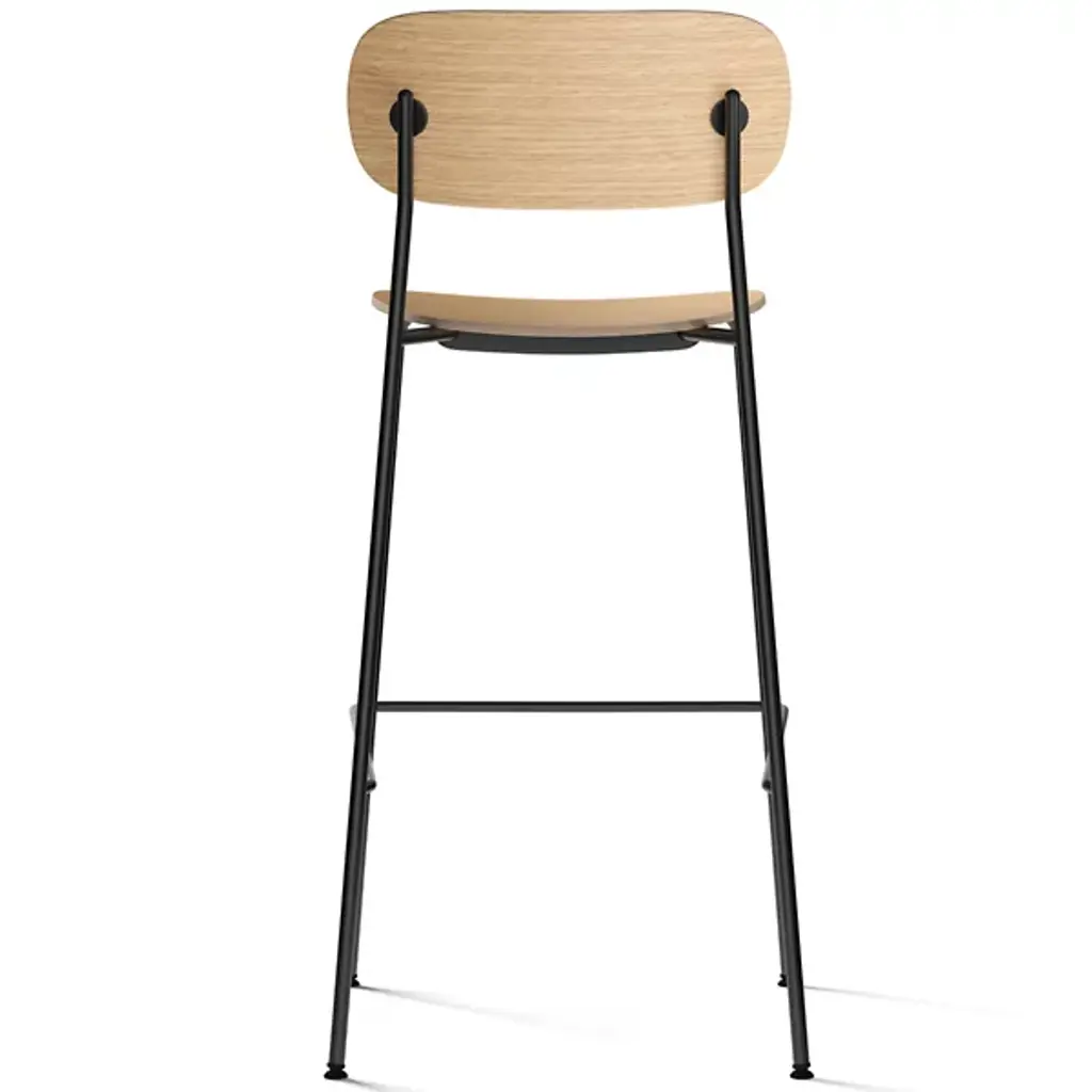 The Co Bar/Counter Chair, Non-Upholstered from Audo Copenhagen, formerly Menu, allows you to survey your surroundings from an elevated perch. A memorable design collaboration between Norm Architects and Els van Hoorebeeck, it starts strong with an open frame of powder-coated steel that is slender but not spindly, and further reinforced by a bracket-style foot bar. Its curving seat and back are made from beech core plywood, softened by an oak veneer that adds depth and naturalism to the otherwise minimalist design.