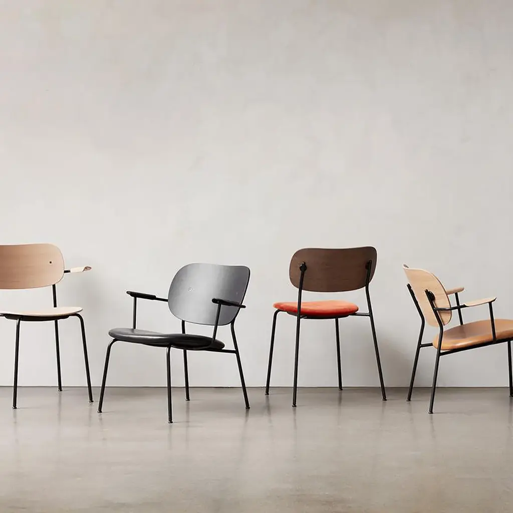 Together, mutually, in common: the words that define the prefix ‘co-’ are at the heart of our new Co Chair design by Menu Design now Audo Copenhagen. Conceived in collaboration with The Office Group and Norm Architects, the multi-functional chair adapts to a wide range of needs and interior styles. It addresses the space and design challenges shared by spaces both private and public, making it as appealing in homes as in shared areas like conferences, boardrooms, and touch-down co-working lounges. Drawing on The Office Group’s extensive knowledge of workplace needs, the Co Chair pairs a lightweight, sleek profile with great seating comfort. Aesthetically, the design’s contoured form and warm materials bring Norm Architects’ signature, human-centered minimalism to residential and hospitality applications. The design’s versatility is the result of a thoughtful construction and a wide array of materials: with numerous veneer finishes and upholstery options to choose from, the Co Chair is easy to customize to create the desired expression and experience. The chair is distinguished by a wide veneer back, whose proportions allow freedom of movement and provide maximum comfort. Comfort also led the design of the backrest, which is positioned and angled for exceptional support. The Co Chair’s slender yet robust powder coated steel frame defines the intriguing geometric silhouette – and delivers high durability. Optional veneer armrests adding another aesthetic and functional dimension, serving both for added comfort and for suspending the chair off the floor for easy cleaning. Features