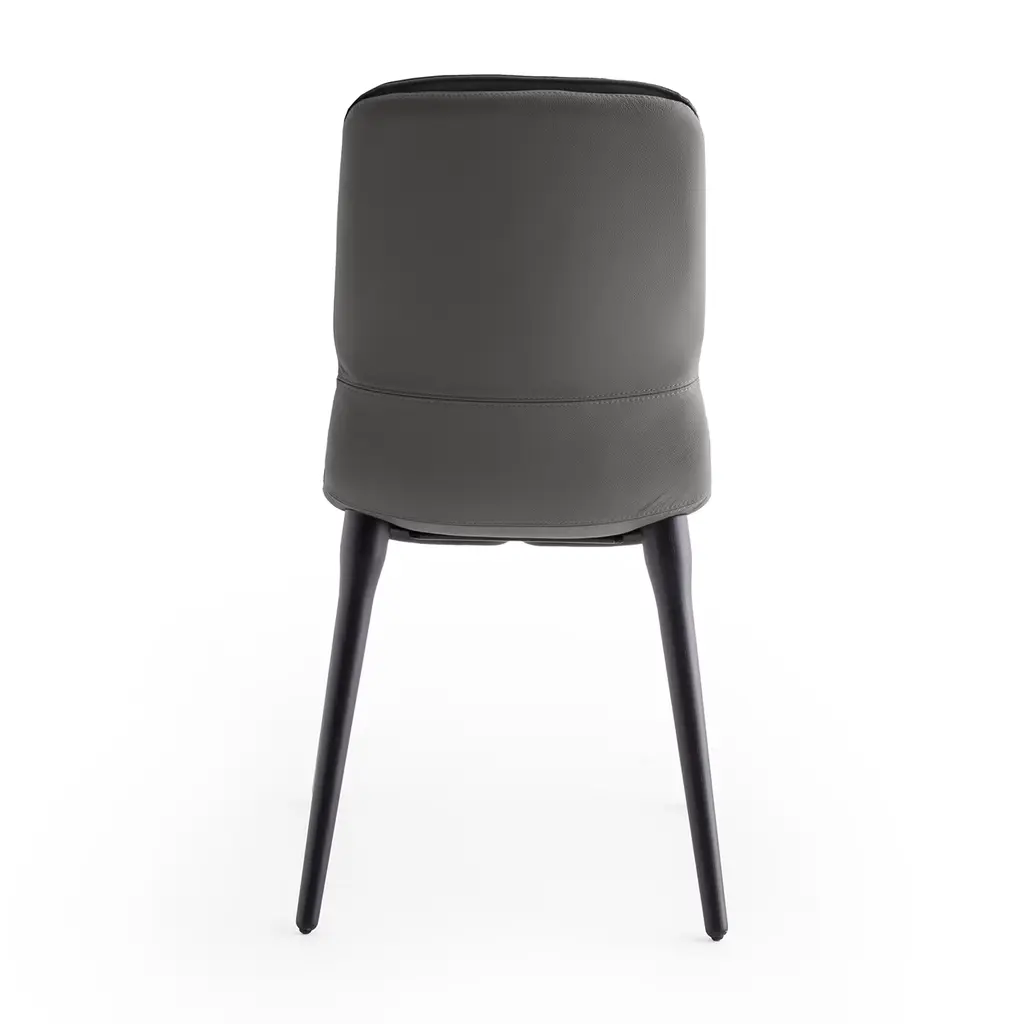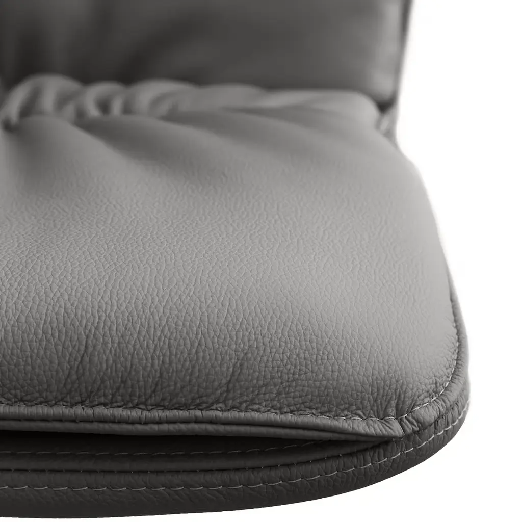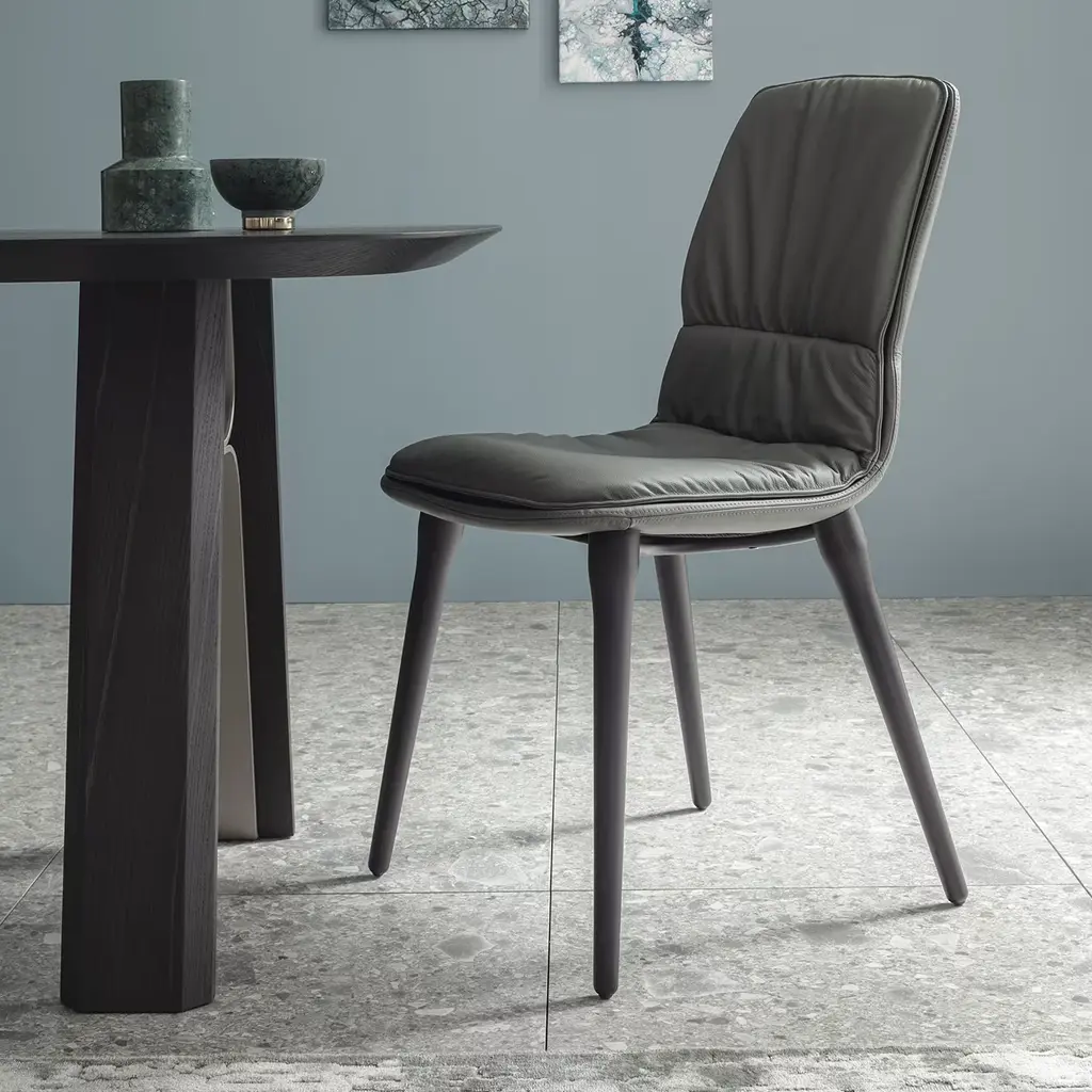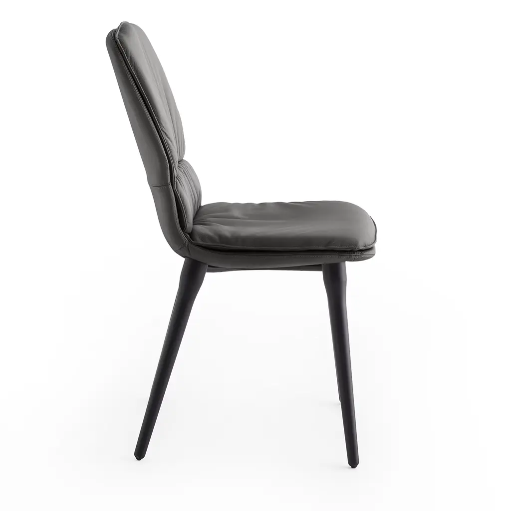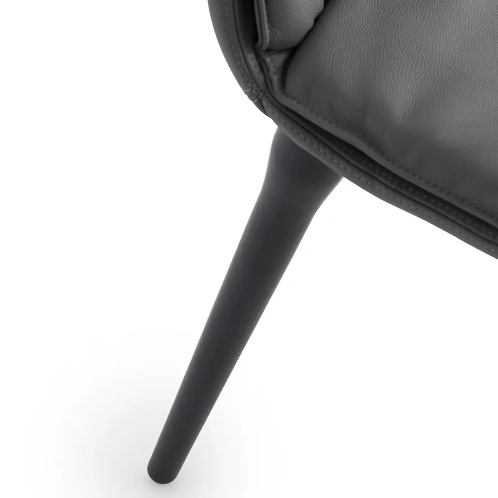 Offered in a solid-gray version of unfailing class, this chair was designed with elegance and sleekness in mind. The distinctive trait is the fine leather enveloping the whole seat, enhanced by a pleated design across the low back area and concealing the generous combination of high-density foam and thermo-curved MDF shell. Coupled with a metal frame, tapered ash legs complete the design.