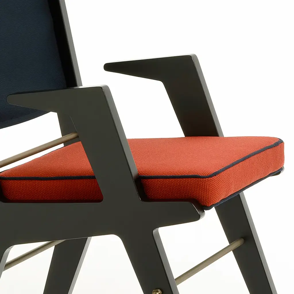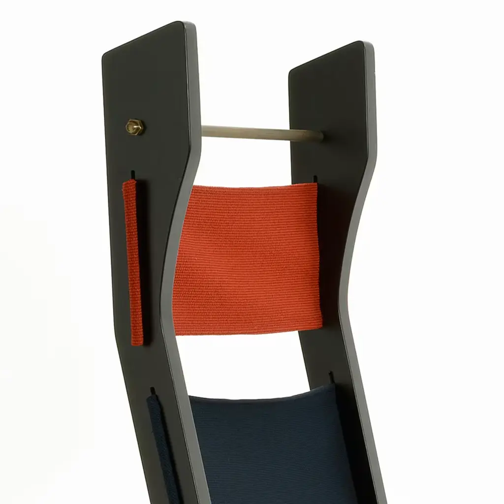 This chair stands out with the evocative grandeur of a throne. The sharp angular forms of the armrest paired with the high back make this throne fit for royalty. The structure is in matte black lacquered MDF, with elements in solid beechwood. In this piece, the seat, backrest and headrest are made of wool fabric in shades of red African Novum and indigo blue.