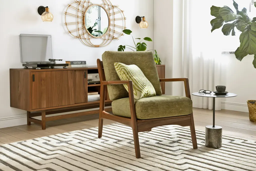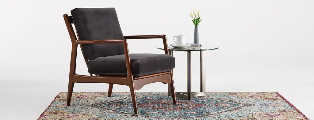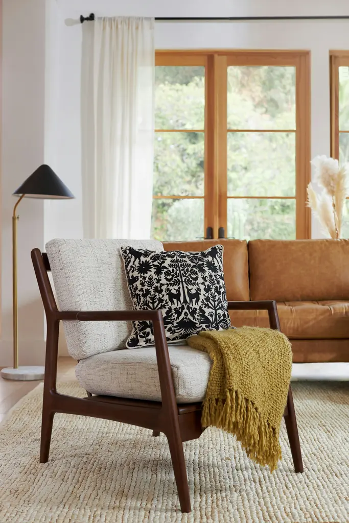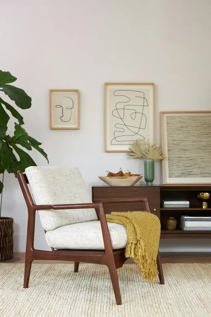 A classic rake-back wooden armchair with artfully carved angles that will offer unparalleled support and stir nostalgia. Some designs are so good the first time around that we prefer not to tamper with perfection. The Collins chair delivers loads of warmth and durability through its artful lines and raw materials that are contrasted so elegantly against any textured upholstery. It’s a clear standout in our Mid-century textbook for form and function, either as a stand alone or a companion piece.