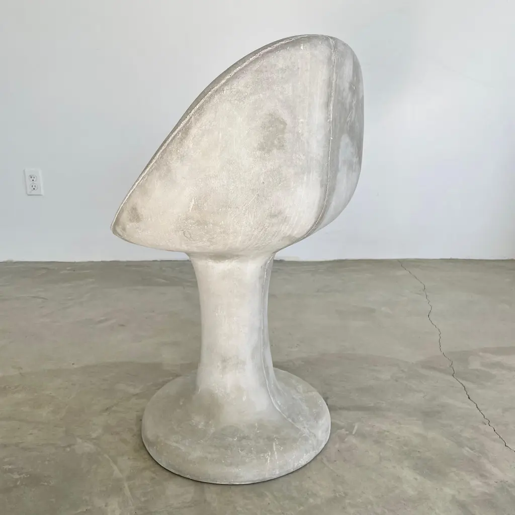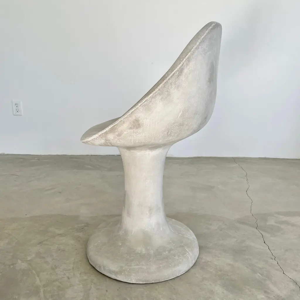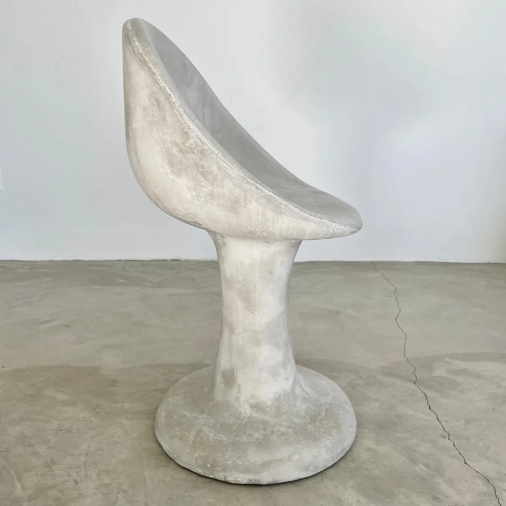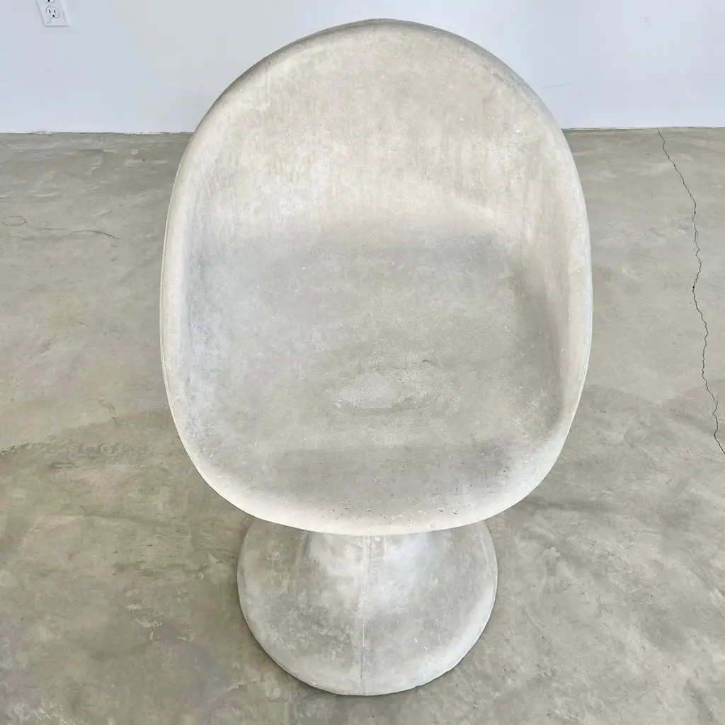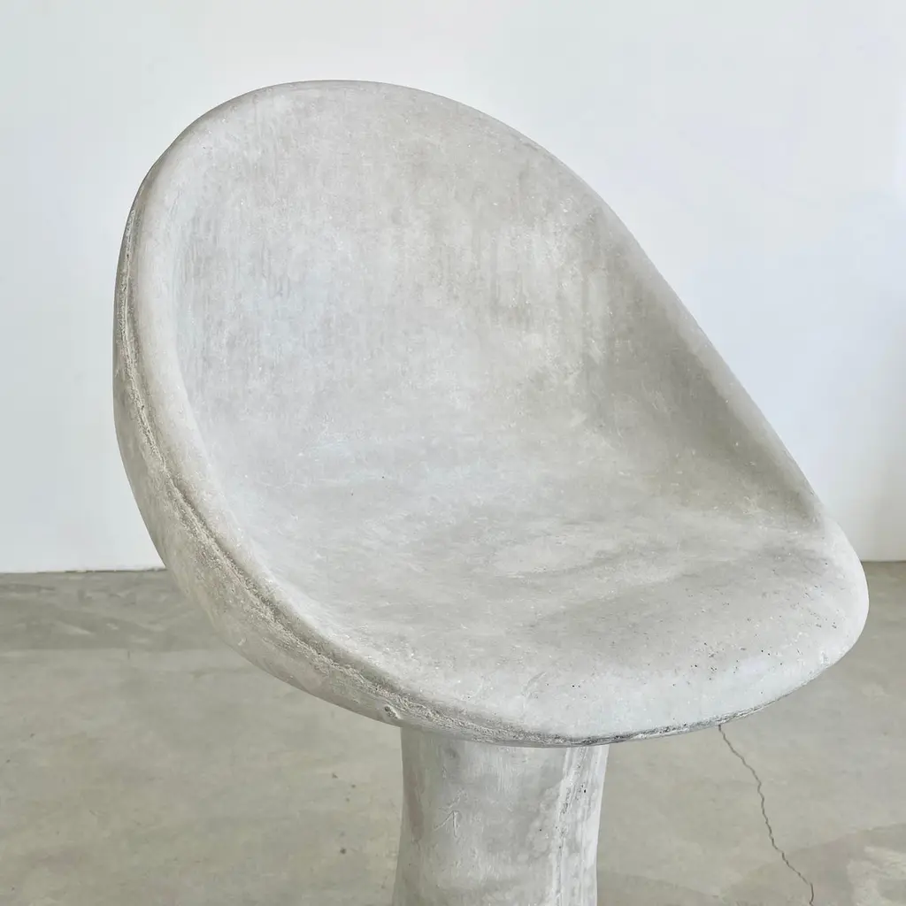 Minimal concrete chairs with a tulip style base and a scoop seat. Handmade by Merit in Los Angeles. These chairs feature a lower seat back and a heavy base which gives them great balance and more stability. Beautiful design that is extremely heavy and well made. Priced individually. 4-5 in stock. Lead time 4 weeks for larger orders. Different finishes available.