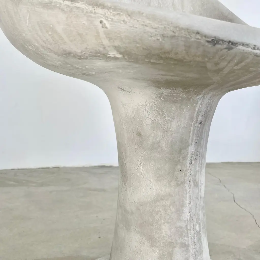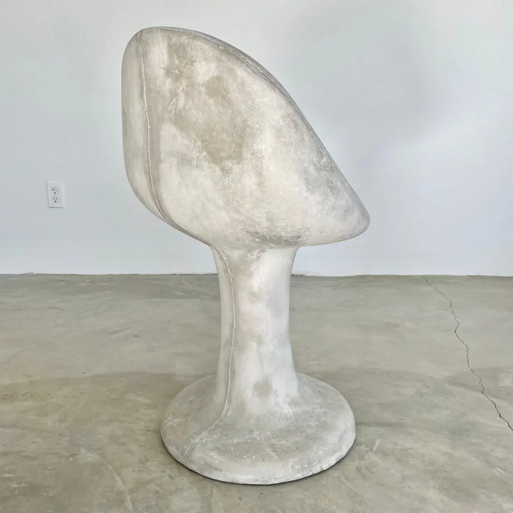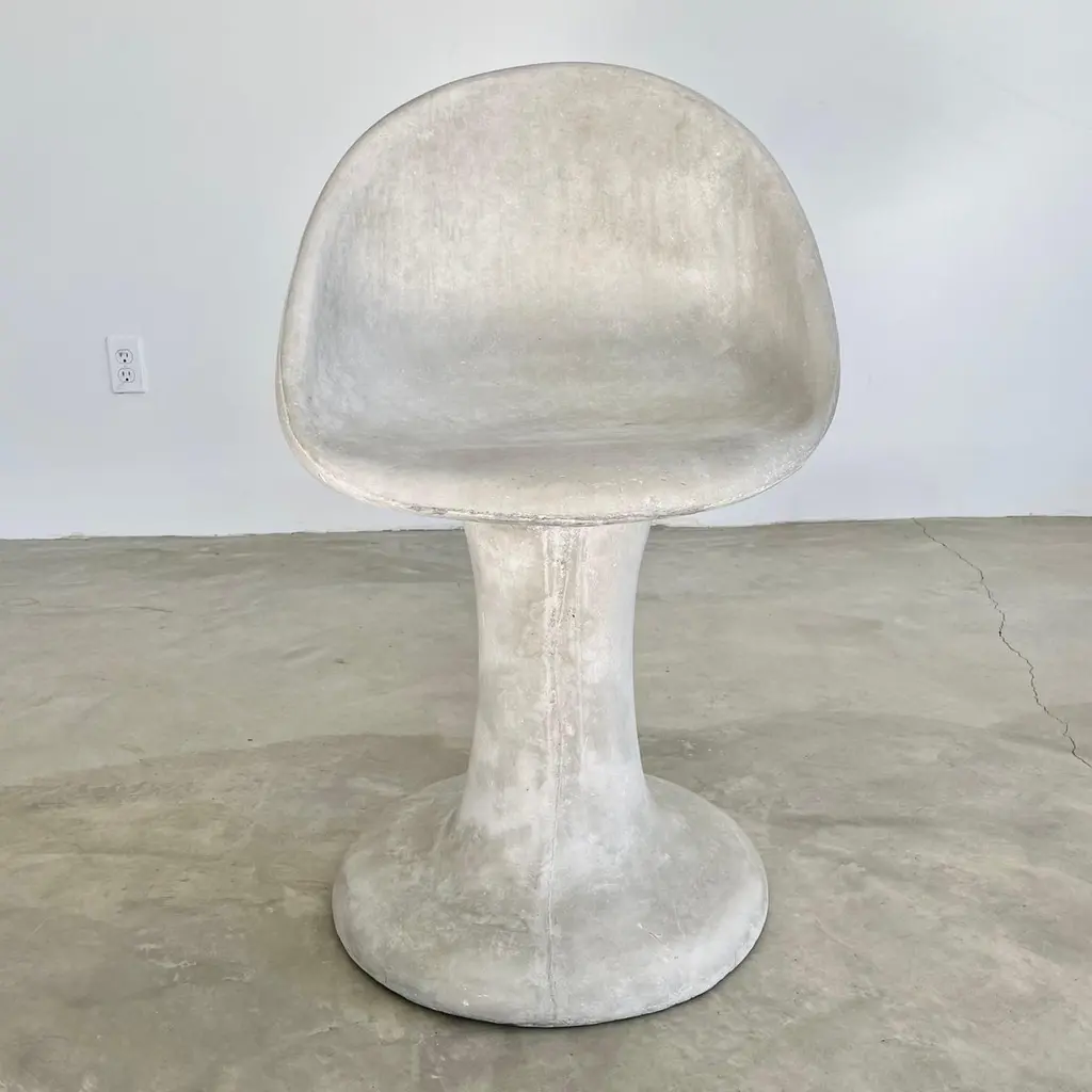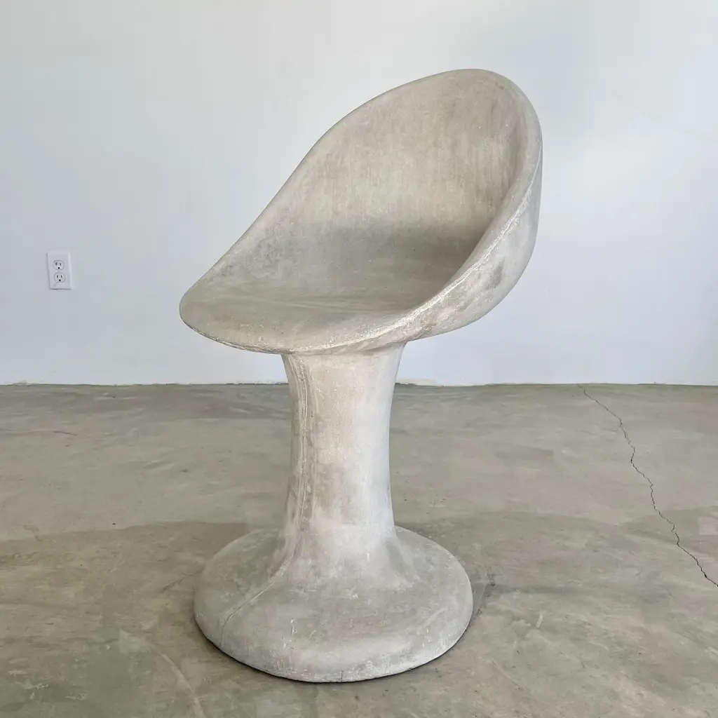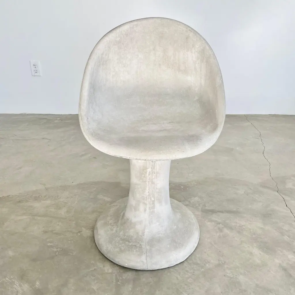 Minimal concrete chairs with a tulip style base and a scoop seat. Handmade by Merit in Los Angeles. These chairs feature a lower seat back and a heavy base which gives them great balance and more stability. Beautiful design that is extremely heavy and well made. Priced individually. 4-5 in stock. Lead time 4 weeks for larger orders. Different finishes available.