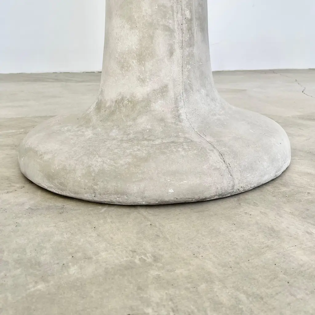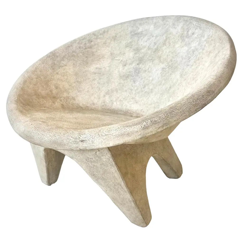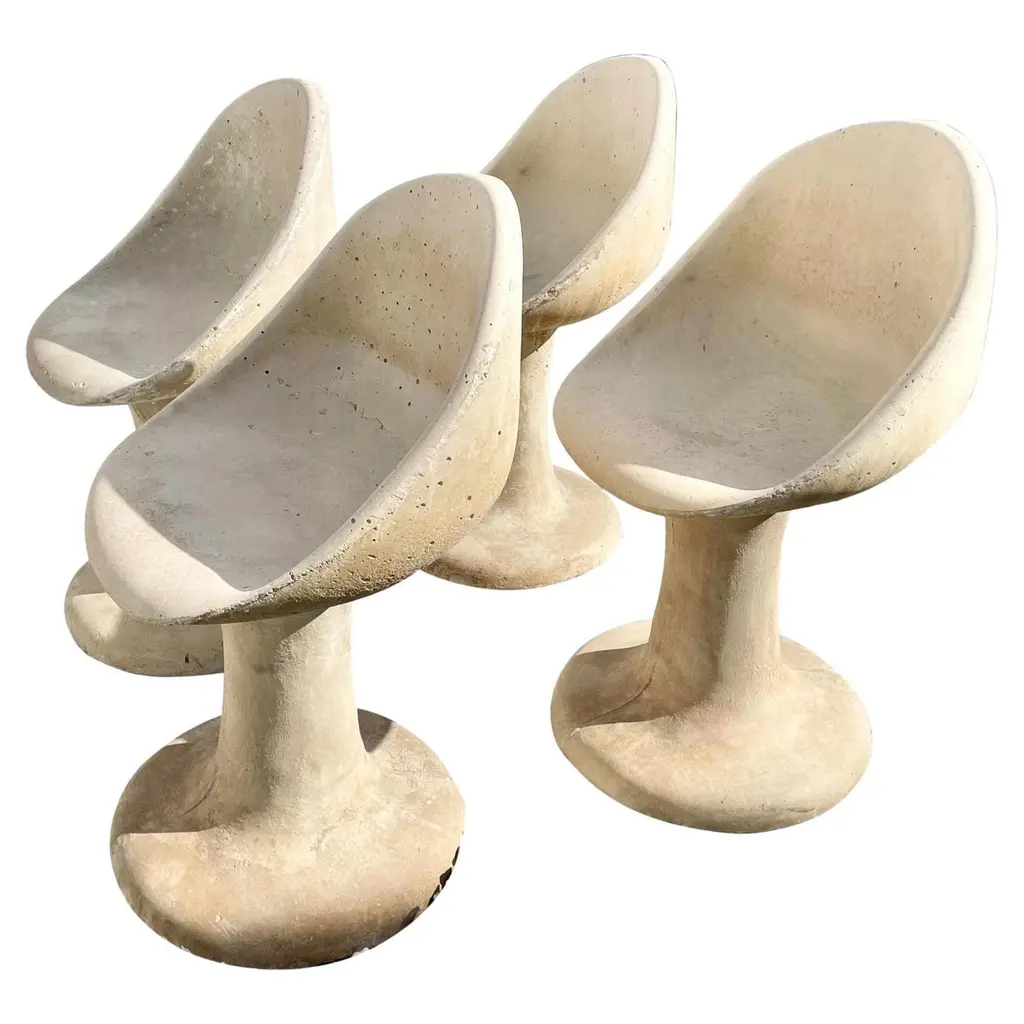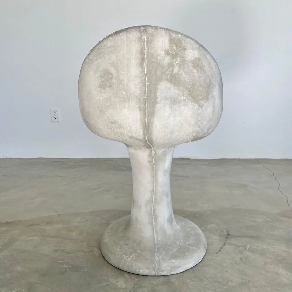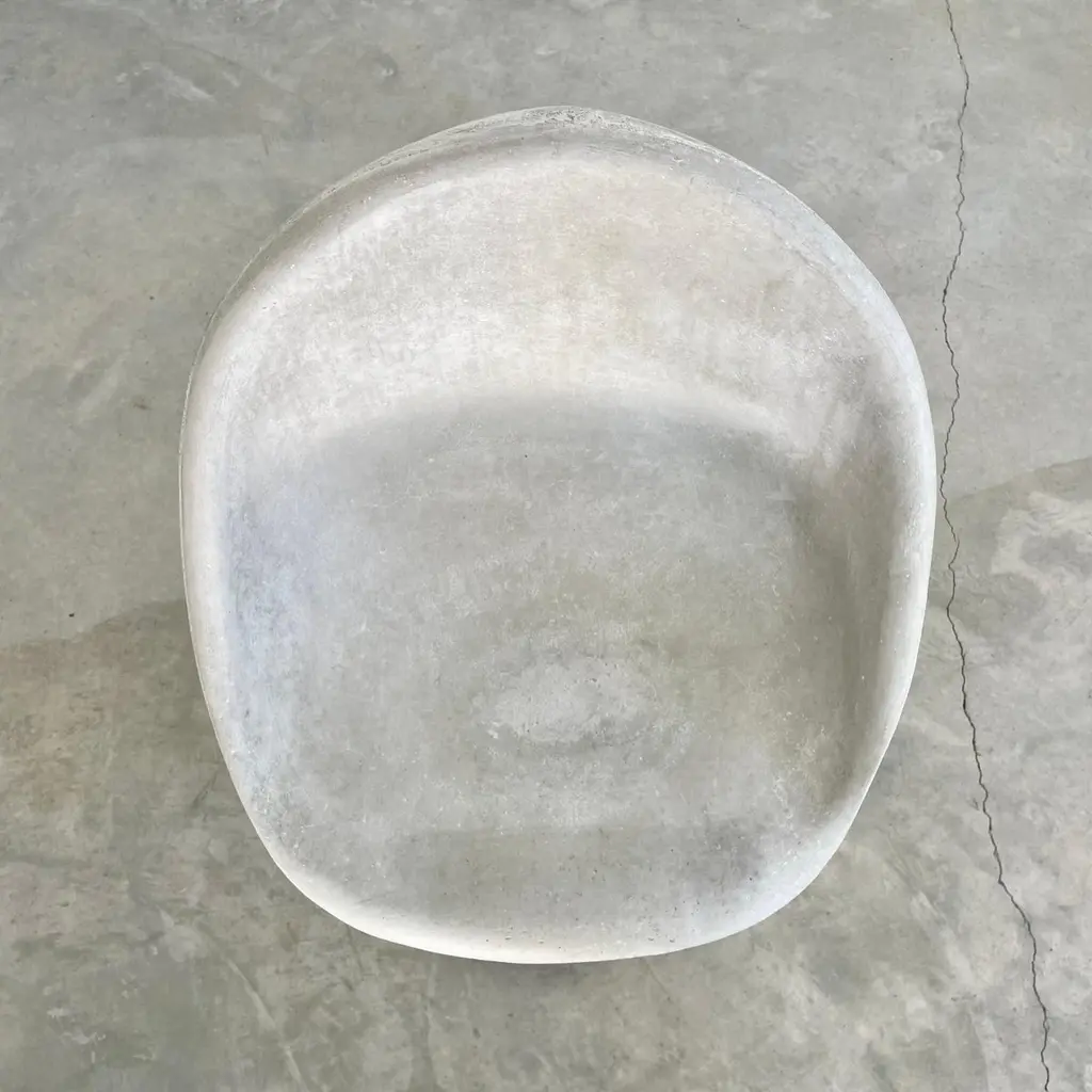 Minimal concrete chairs with a tulip style base and a scoop seat. Handmade by Merit in Los Angeles. These chairs feature a lower seat back and a heavy base which gives them great balance and more stability. Beautiful design that is extremely heavy and well made. Priced individually. 4-5 in stock. Lead time 4 weeks for larger orders. Different finishes available.