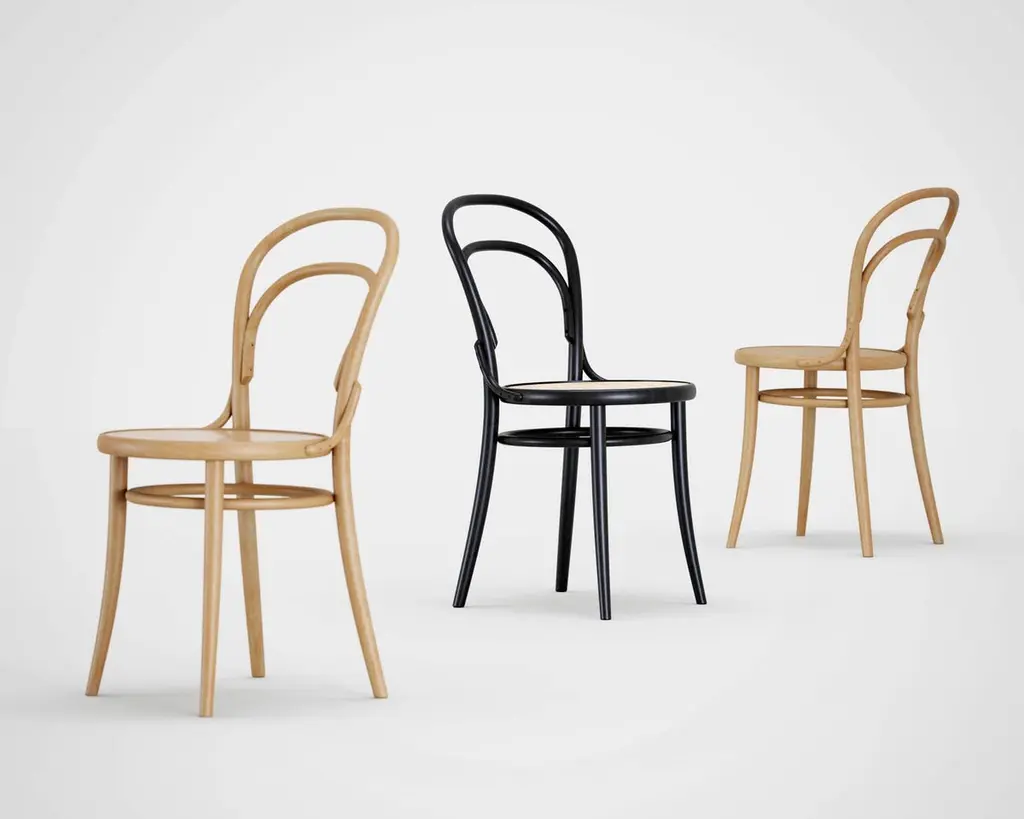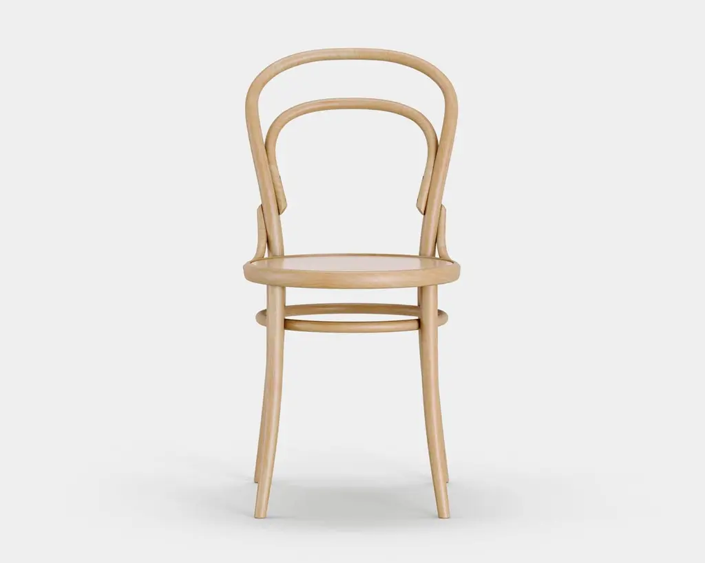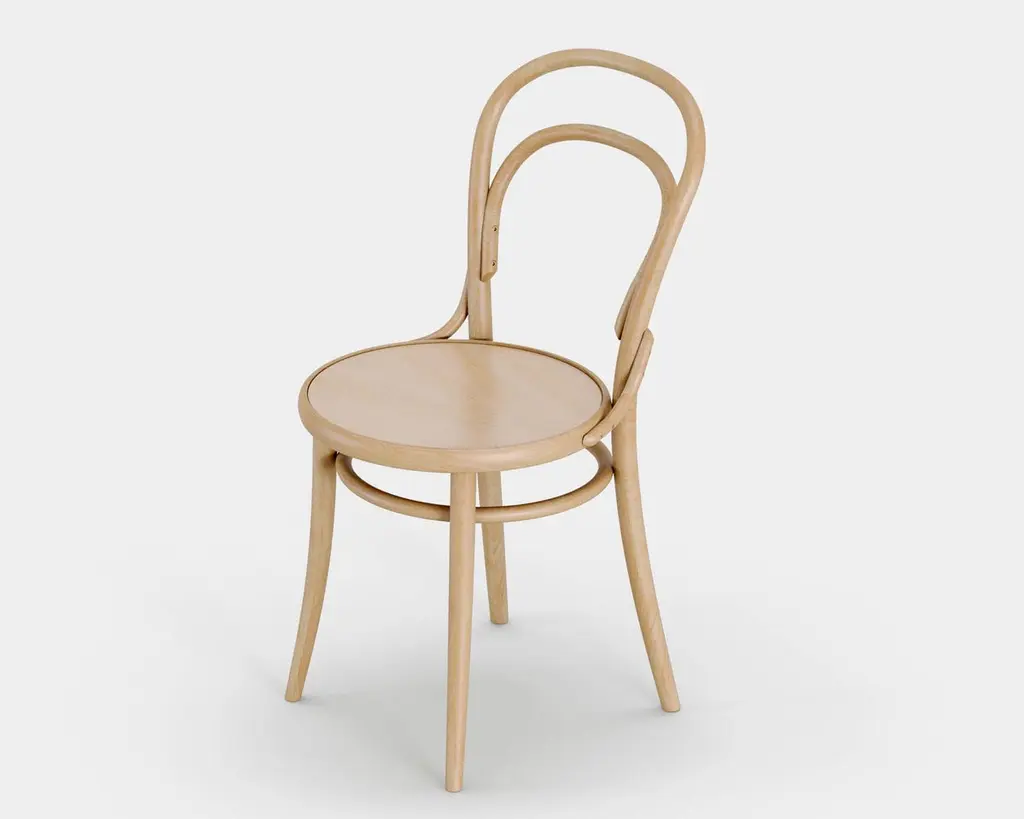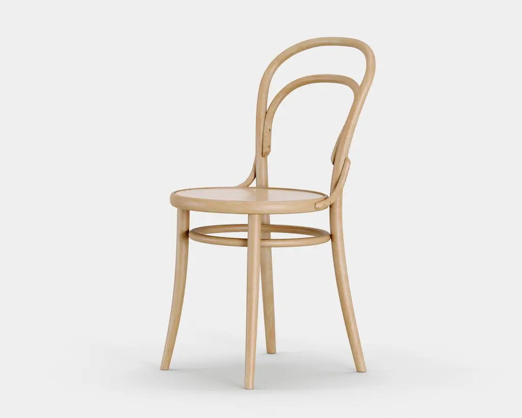 Chair No. 14Iconic bistro chair conceived by Michael Thonet in 1869, now produced in the same manufacture in Czech Republic by TON. Wood: solid beech Finish: natural light Seat: plain wood --Chair no. 14 by TON is one of the oldest, most popular and variated furniture classics of all time. It was first introduced in 1869 by the Czech cabinetmaker Michael Thonet, and so far over 80 million chairs have been sold globally. Characterized by a curved and delicate silhouette, Chair 14 gained popularity in the cafés of Vienna, and thus became known as the "café chair".Chair no. 14 is still manufactured at the TON furniture factory in Czech Republic by traditional methods: the robust frame is crafted from six beechwood rods that have been bent by hand. Even though the chair was designed more than 150 years ago, its light and timeless design remain popular from generation to generation.