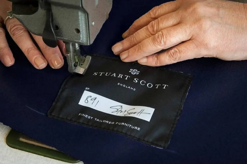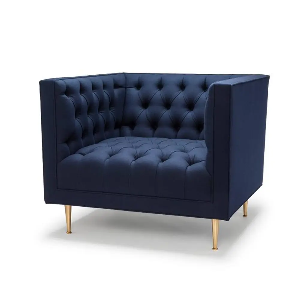The Tux is our contemporary interpretation of the Classic Chesterfield. The deep buttoning and tailored detailing make this piece a personal favourite. Tux Chair Special Edition shown here upholstered in Navy Melton Wool with legs in natural brass. For this piece we have used Abraham Moon & Son for their wonderful Melton wool. Moon have been producing wool since 1837 and are unique in being a fully vertical mill, with all processes taking place on their site in Guiseley, Yorkshire.Construction: solid beech frame with a sprung seat. Seat, back and inside arms are all traditionally deep buttoned, with hand turned pleats. The legs are precision engineered from solid brass.We finish our brass legs with Renaissance Wax. Over time the finish will gently patina.Each Stuart Scott piece is built by hand in our workshop in Wiltshire, England. Nothing is mass-produced. This ensures complete attention to detail, structural integrity and sheer build quality. We never compromise. When we finish each piece, it is signed and numbered: a unique hand-made masterpiece.