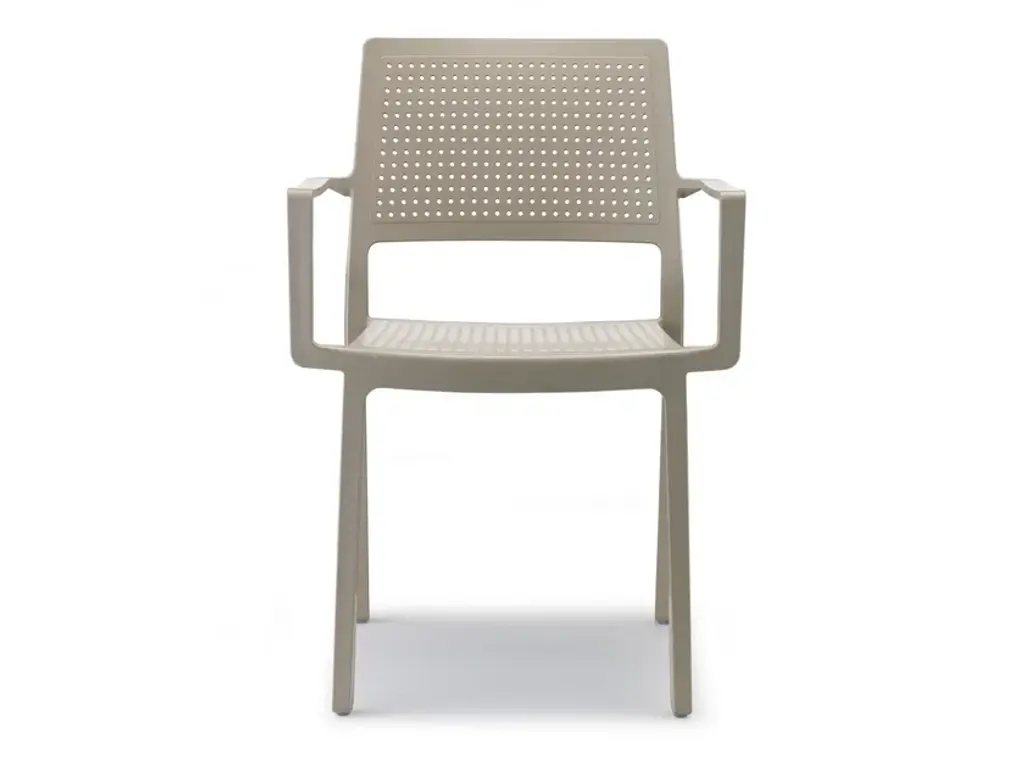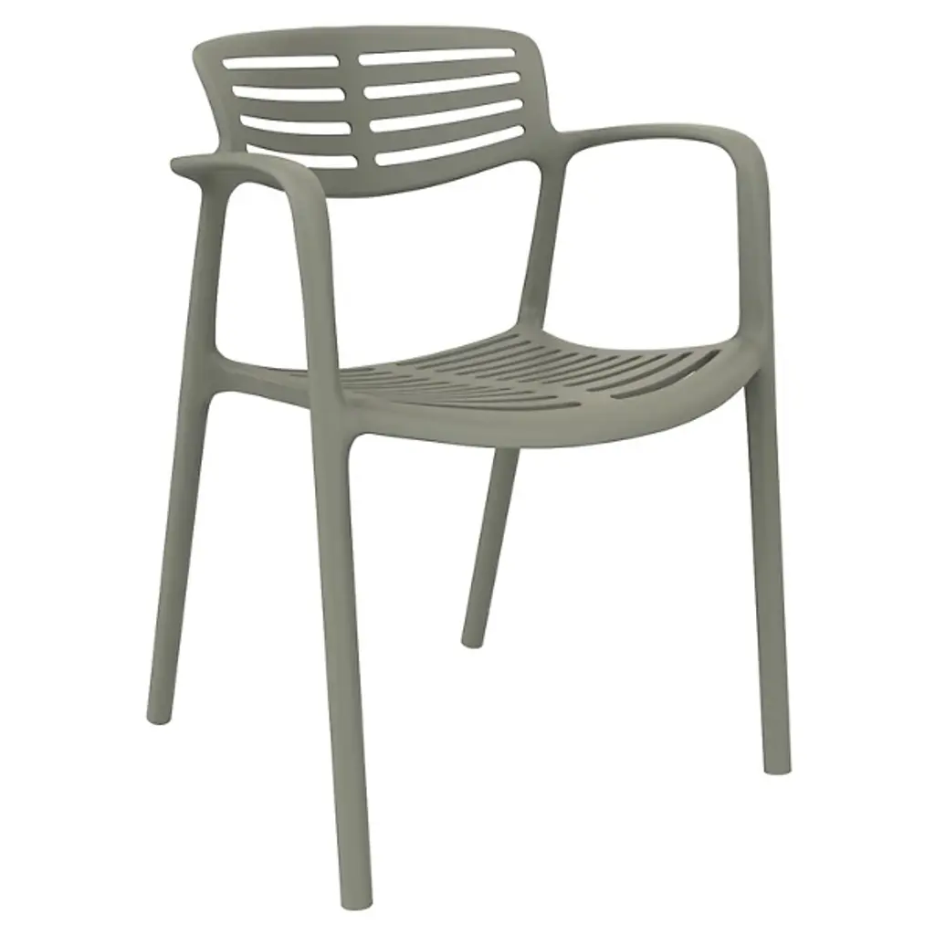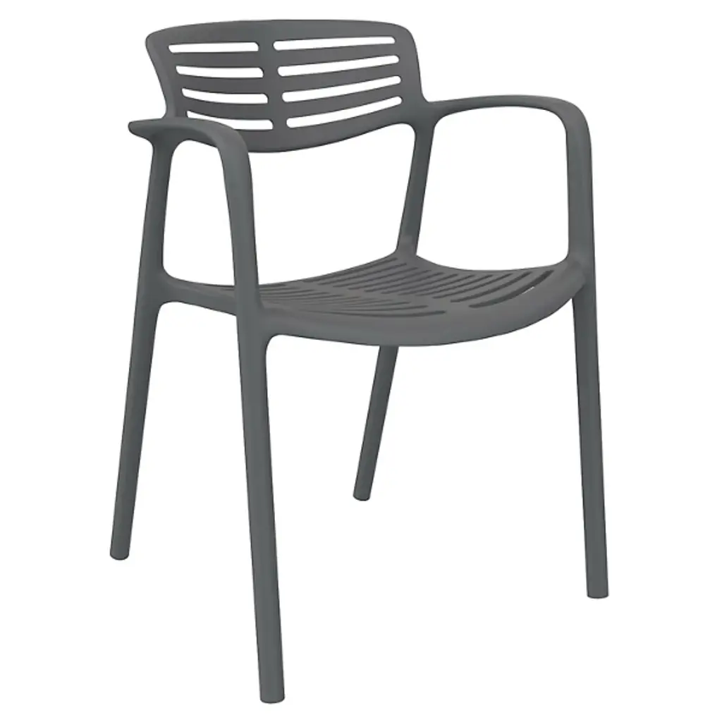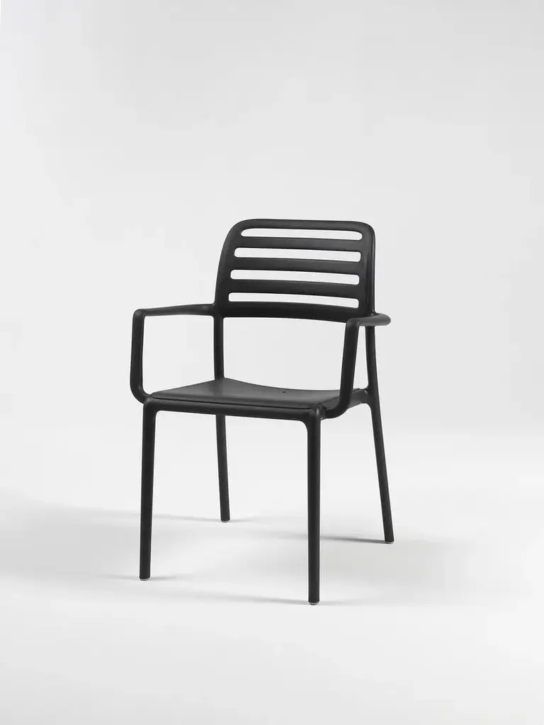 A chair with minimalist lines, with armrests and a slatted backrest, Costa is ideal for various furnishing solutions in outdoor and indoor contexts. Its seamless frame, with rounded profiles and corners and original and lightweight design, is made of recyclable UV-treated and mass-coloured fiberglass resin with a matt finish. Easily stackable, Costa is available in light blue, agave, dove grey, anthracite, white and red. Fitted with non-slip feet, Costa is available in the following dimensions: W. 58.5 cm and D. 57 cm, with a backrest H. 86 cm and seat H. 46.5 cm.Ideal for outdoor and indoor use.