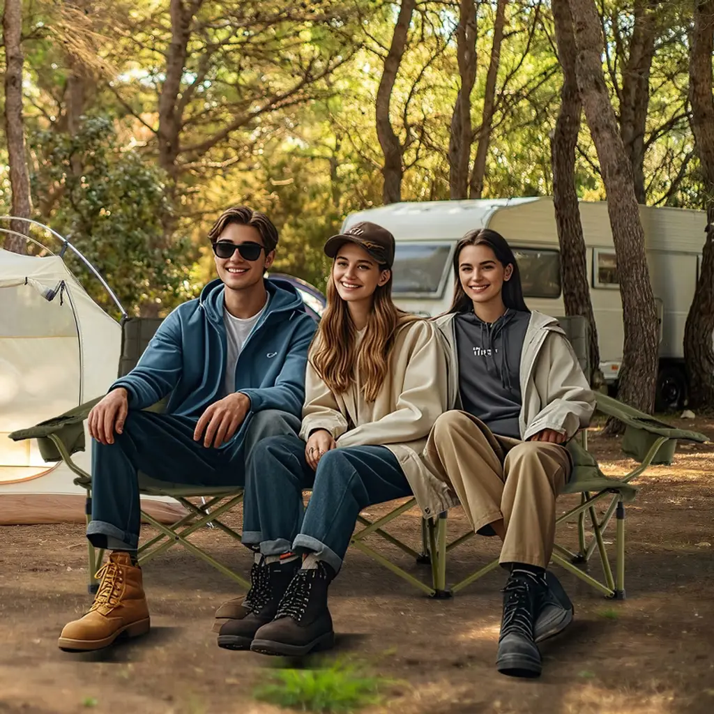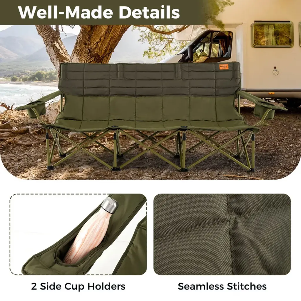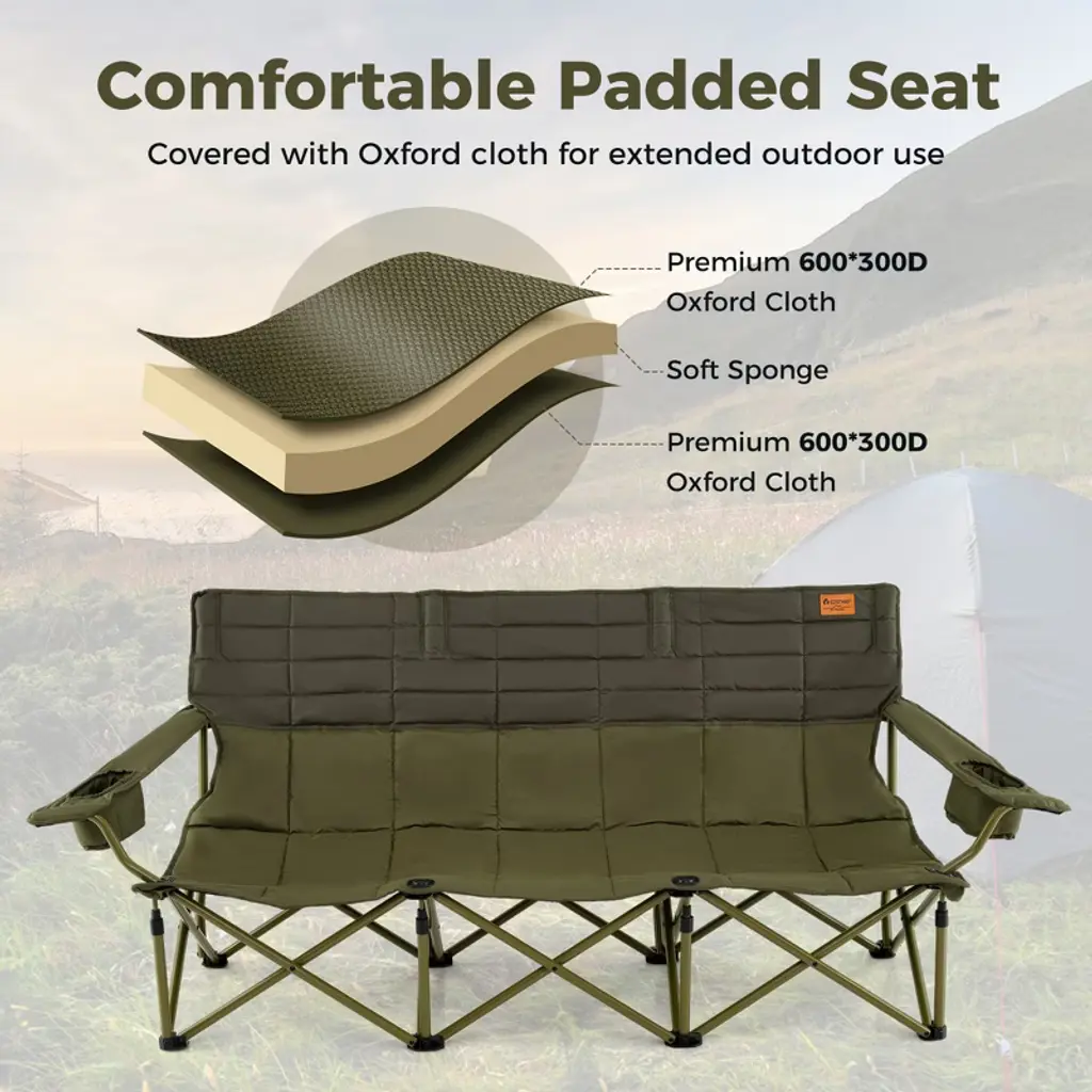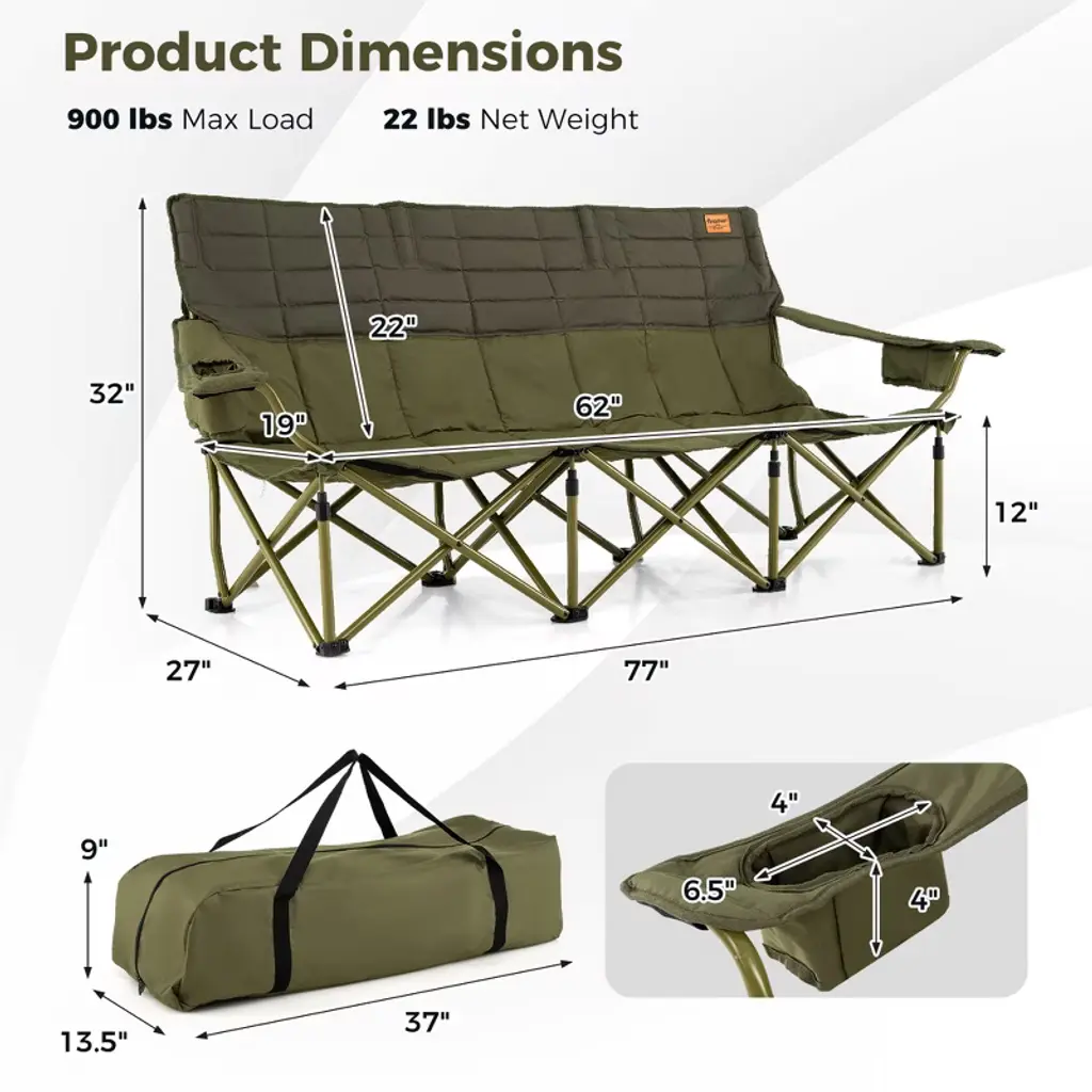 This oversized 3 person camping chair combines versatility with heavy-duty design to provide a perfect seating solution for various outdoor activities. With a generous seat size of 62” x 19”, the camp couch comfortably accommodates up to 3 adults. The padded seat is covered with Oxford cloth for extended outdoor use and ultimate comfort. The reinforced metal frame with well-painted surface supports a maximum load of 900 lbs and strengthened by large foot pads. Moreover, the foldable design and included carrying bag ensure easy portability. And the height adjustable armrests with 2 side cup holders provide added convenience. Whether you’re enjoying a quiet beach day, a lively camping trip, or a serene fishing excursion, this overside chair with well-made details will offer the optimal outdoor seating experience. Embrace your adventures with ease and comfort with this portable camping chair. FeaturesExtra wide chair eats up to 3 adults comfortably Padded seat with soft and elastic sponge for comfort Oxford cloth with seamless stitches for longer service life Lightweight, only 22 lbs for easy portability Foldable design perfectly fits into included carrying bag Reinforced metal frame supports up to 900 lbs Adjustable armrests with built-in cup holders for more convenience Enlarged footpads enhance stability Versatile for camping, fishing, and picnics Color: Green/Navy Blue Material: Metal, Oxford Cloth, Sponge Overall Dimension: 77” x 27” x 32” (L x W x H) Dimension of Storage Bag: 37” x 13.5” x 9” (L x W x H) Seat Dimension: 62” x 19” Seat Height: 12” Size of Cup Holder: 6.5” x 4” (L x W) Max Load Capacity: 900 lbs Net Weight: 22 lbs Package Includes: 1 x 3-Seat Camping Chair 1 x Storage Bag 1 x Instruction