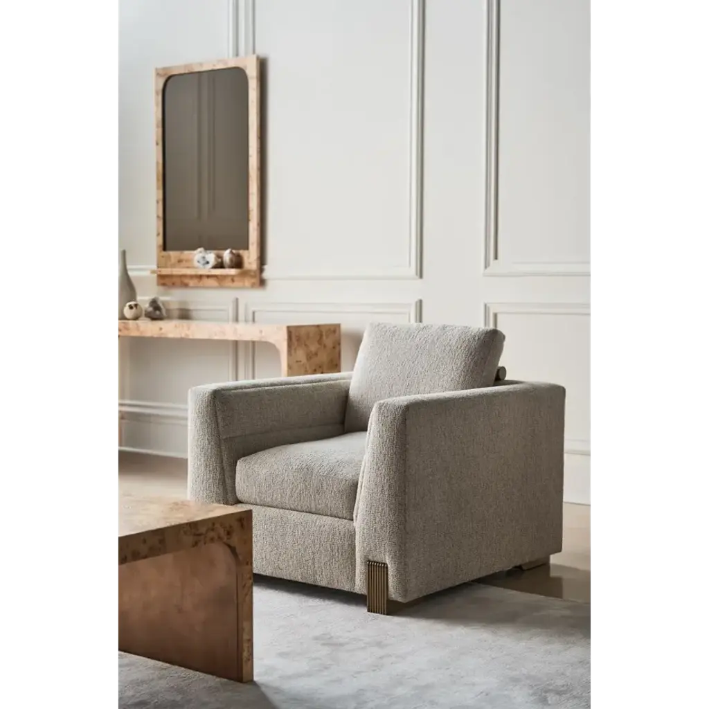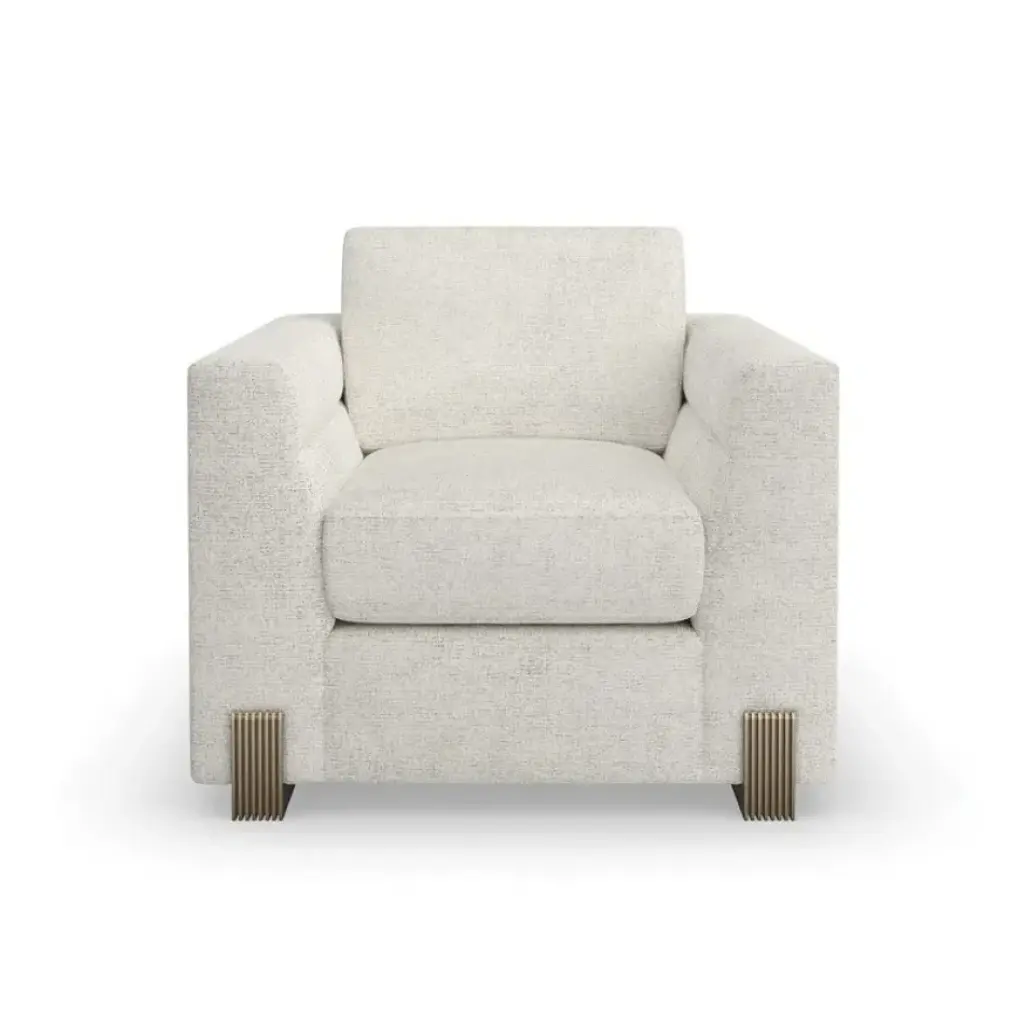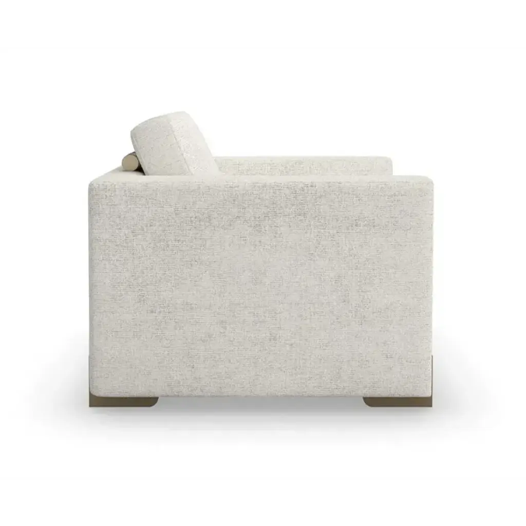 A perfect alignment of texture, material and design intention lends a soft-lined yet sophisticated style to seating areas. Dressed in an oatmeal melange woven fabric with subtle rust threading, its comfortable design features channel-tufted arms and a loose back cushion, propped by a faux-leather-wrapped, counter balance capped in Champagne Gold. Reeded cast legs add tactile appeal and a note of distinction.