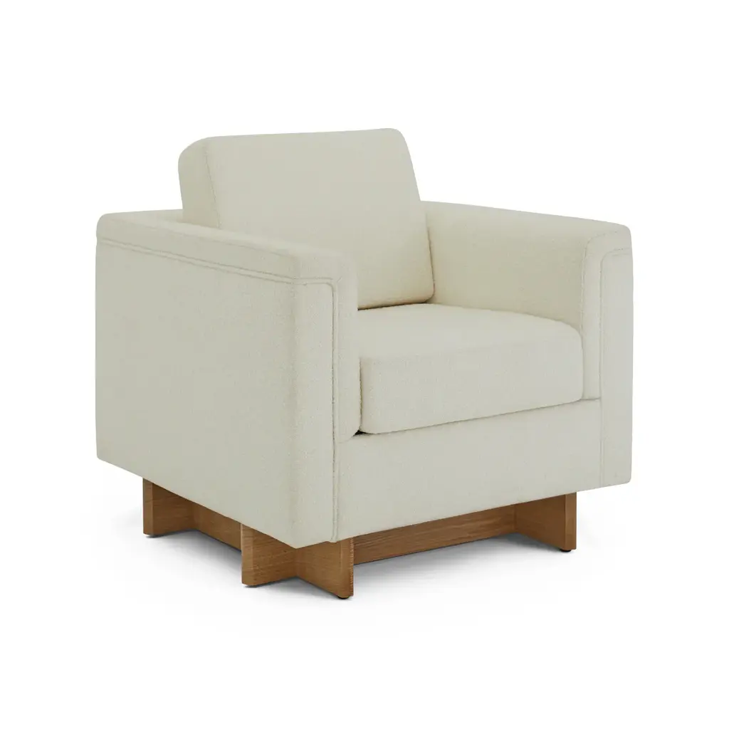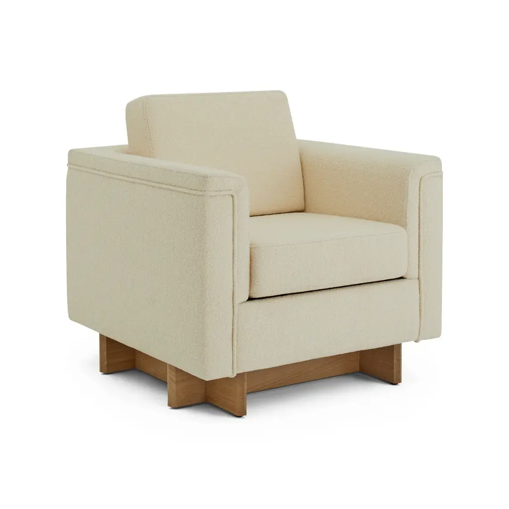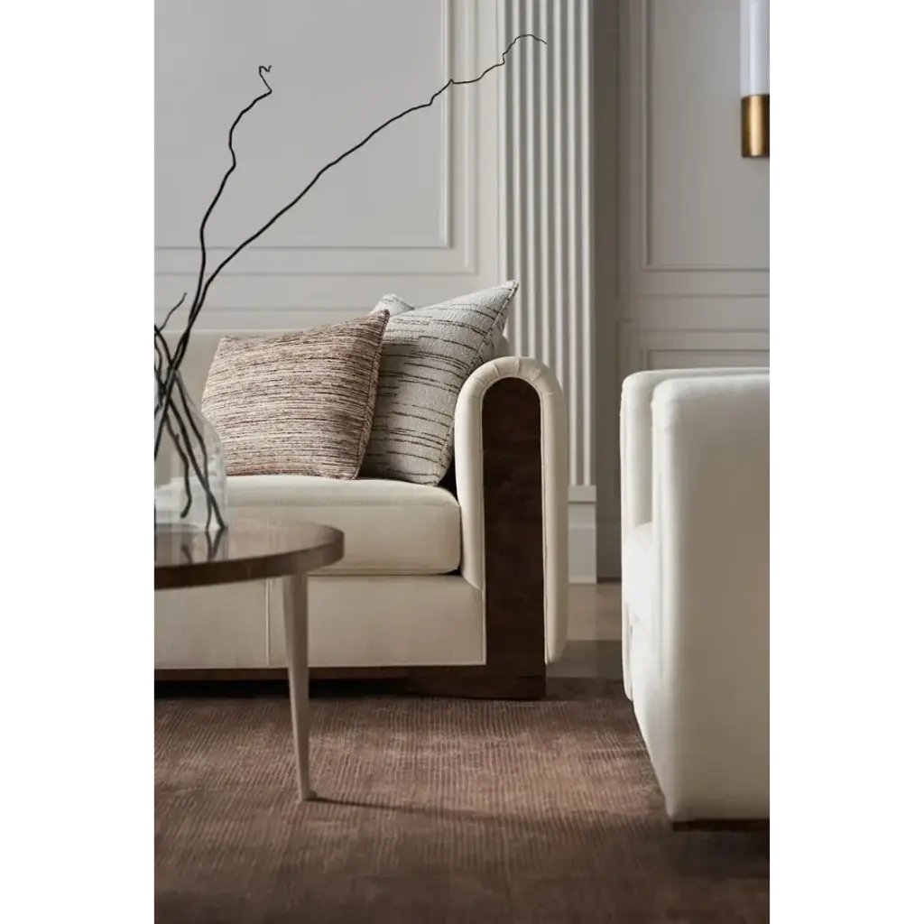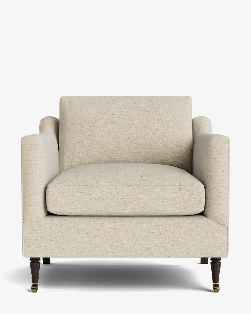 A perfect alignment of texture, material and design intention lends a soft-lined yet sophisticated style to seating areas. Dressed in an oatmeal melange woven fabric with subtle rust threading, its comfortable design features channel-tufted arms and a loose back cushion, propped by a faux-leather-wrapped, counter balance capped in Champagne Gold. Reeded cast legs add tactile appeal and a note of distinction.
